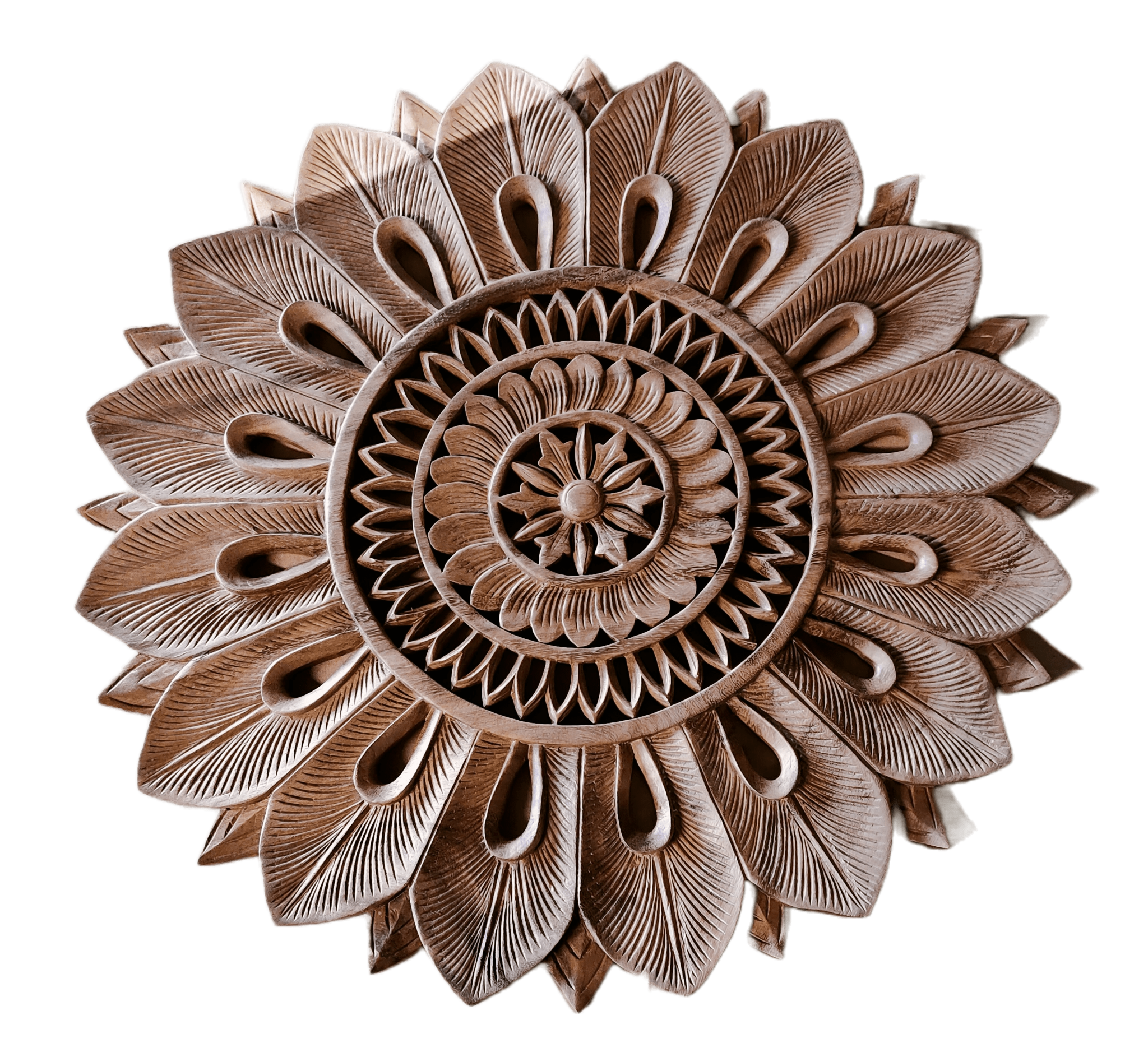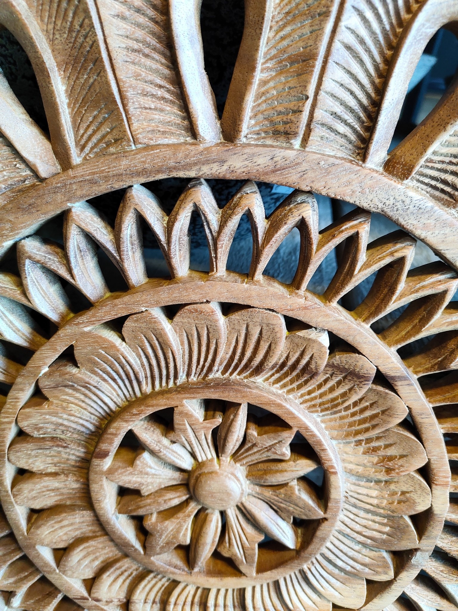 This item may develop some cracks and become grayish in color when placed outdoors. Hand-carved wooden wall panel 60cm with a mandala image