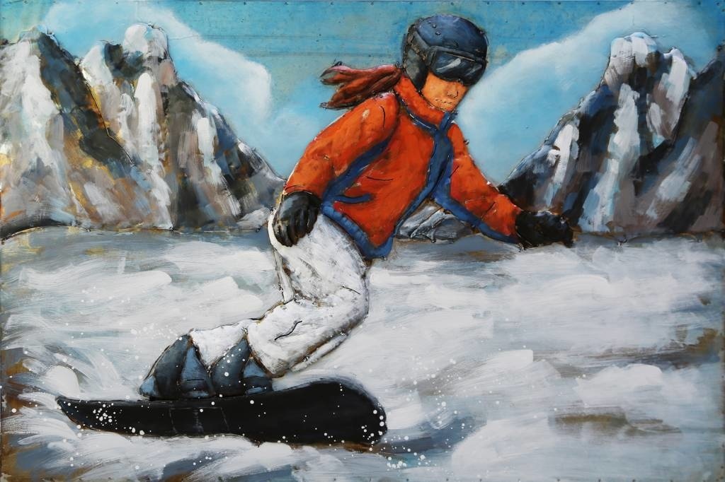 3-D schilderij met een snowboarder, helemaal met de hand gemaakt van ijzer, ook de achtergrond dus.