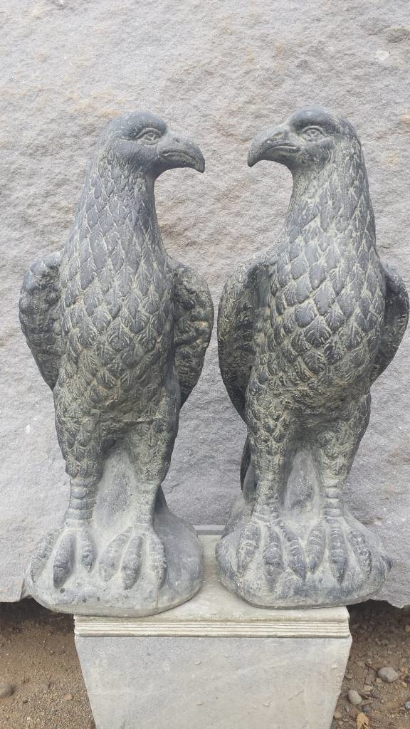 Mooi vormgegeven arenden van gietsteen, zwart/bruin gekleurd. Zeer mooi afgewerkt .