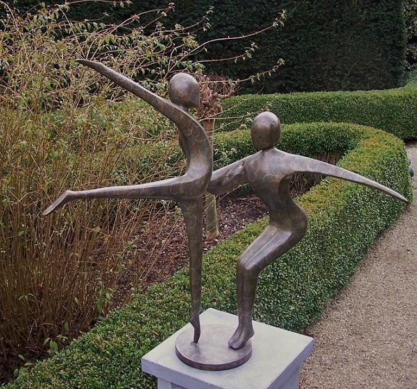 Mooi beeld van een abstract danskoppel van hoogwaardig brons met een minimale kopergehalte van 75% waardoor een zeer lange levensduur gegarandeerd is.