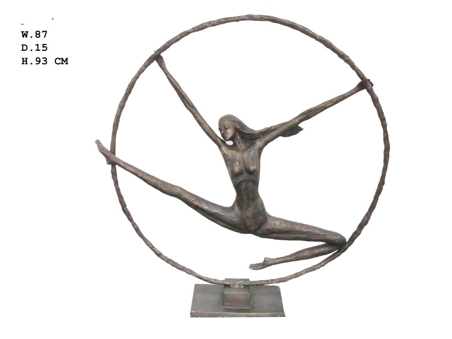 Mooi gedetailleerd beeld van een springende vrouw in een cirkel, op voet, van 100% hoogwaardig brons met een minimale kopergehalte van 75% waardoor een zeer lange levensduur gegarandeerd is en geen lelijke vlekken ontstaan. Een prachtig en duurzaam decoratie object voor huis , bedrijf of tuin, maar ook voor een prachtig geschenk.