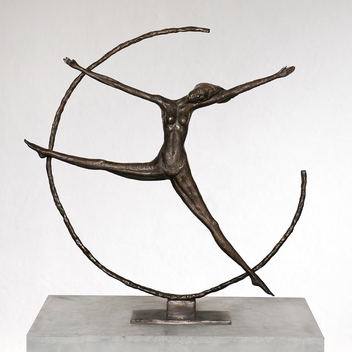 Dit bronzen klassieke beeld van een dansende vrouw in ring heeft de maat ca. 90x11x95cm hoog en is op ambachtelijke wijze gemaakt met de zogenoemde verlorenwas methode.