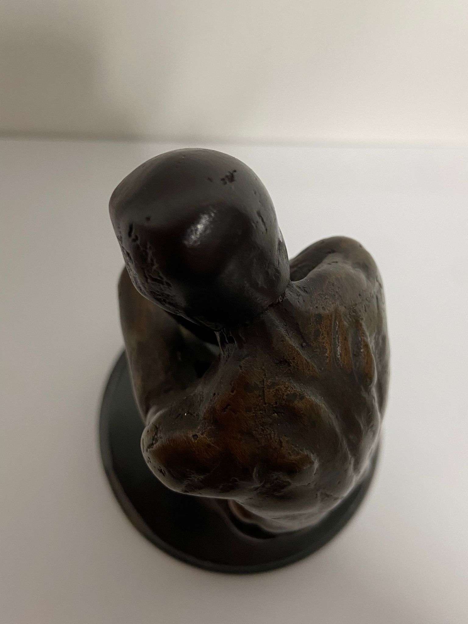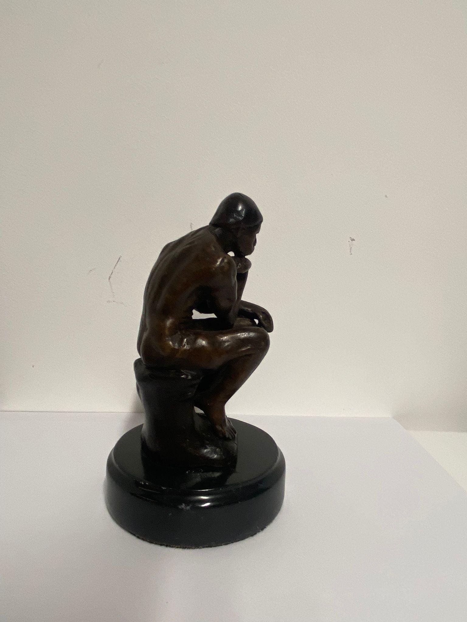 Mooi modern modern vorm gegeven beeld van een denkende man in klein formaat. Gemaakt van 100% hoogwaardig brons met een minimale kopergehalte van 75% waardoor een zeer lange levensduur gegarandeerd is en geen lelijke vlekken ontstaan, en geplaatst op marmer plaatje. Een prachtig en duurzaam decoratie object voor huis , bedrijf of tuin, maar ook voor een prachtig geschenk.