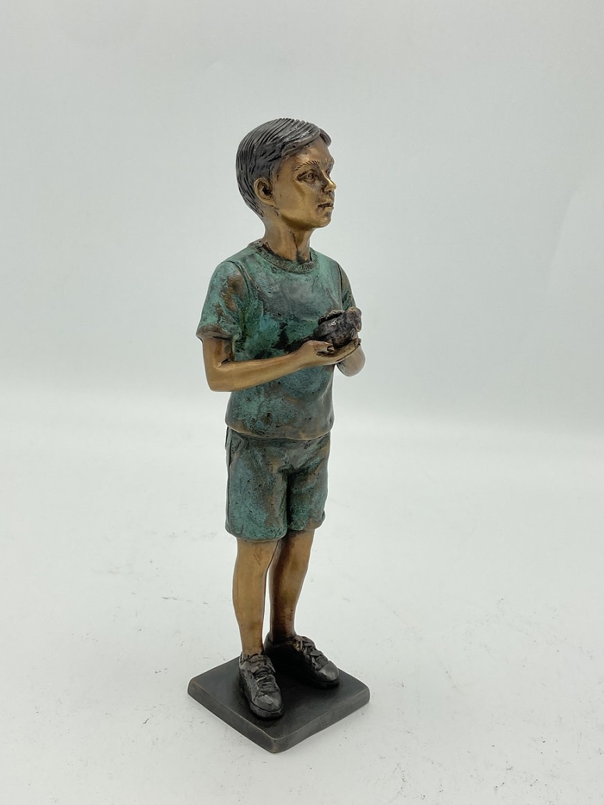 Dit bronzen moderne beeld van een jongetje met een vogeltje in zijn handen heeft de maat 6x5x20cm en is op ambachtelijke wijze gemaakt met de zogenoemde verlorenwas methode.