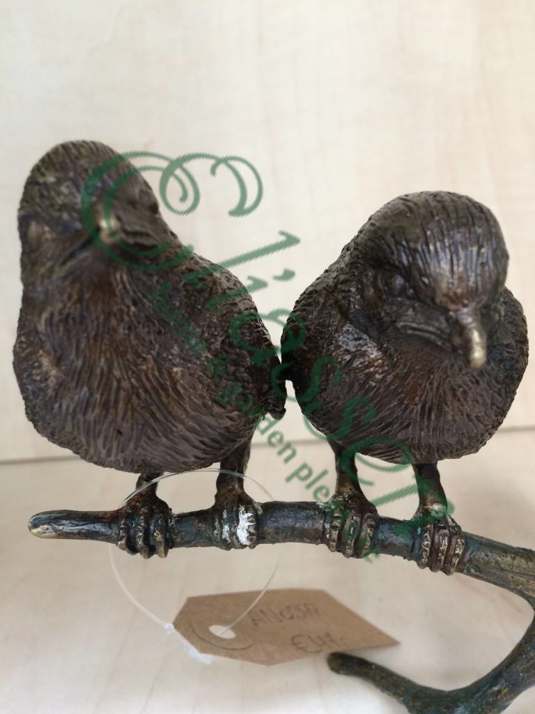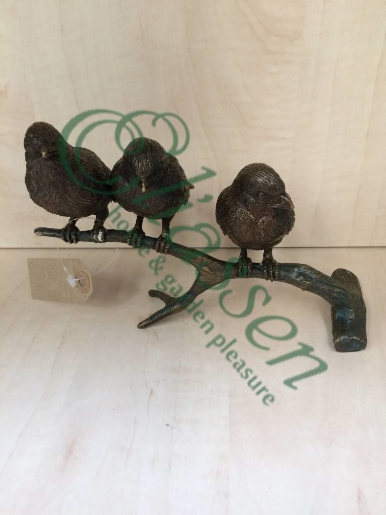Mooi beeld van drie mussen op een tak van hoogwaardig brons met een minimale kopergehalte van 75% waardoor een zeer lange levensduur gegarandeerd is.