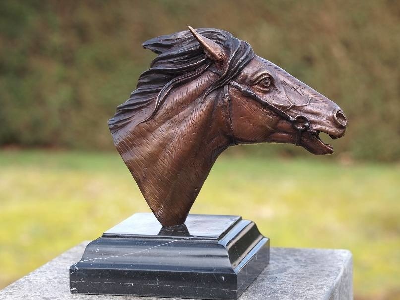 Mooi beeld van een paardenhoofd van hoogwaardig brons met een minimale kopergehalte van 75% waardoor een zeer lange levensduur gegarandeerd is.