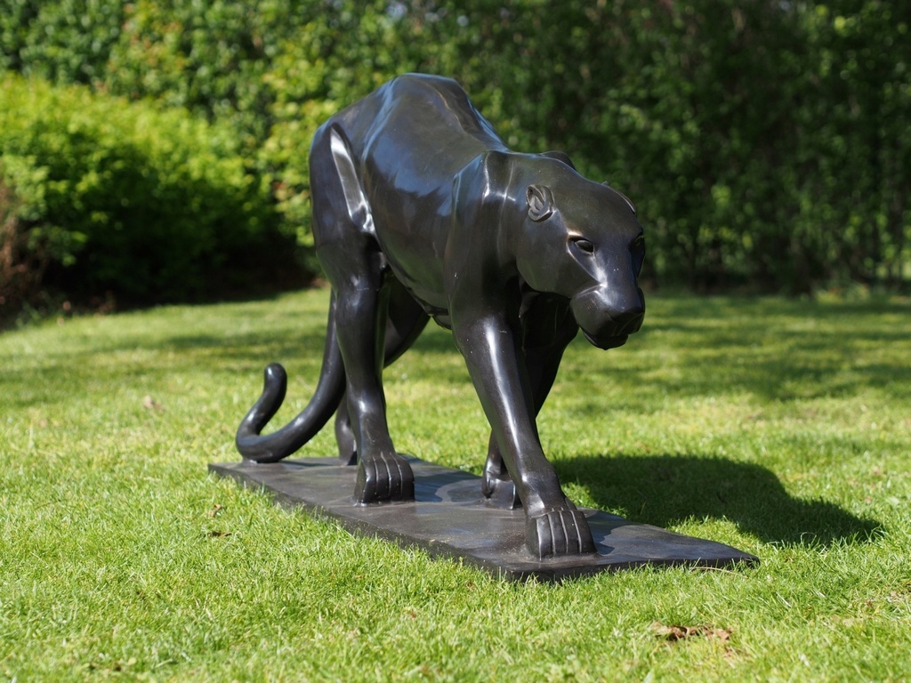 Mooi beeld van een levensgrote panter van echt brons. Het brons van dit beeld heeft een gegarandeerde kopergehalte van 75%, wat de levensduur en uitstraling zeer ten goede komt.