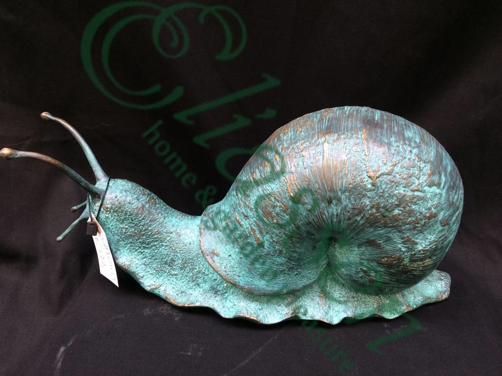 Mooi beeld van een reuzenslak van hoogwaardig brons met een minimale kopergehalte van 75% waardoor een zeer lange levensduur gegarandeerd is.