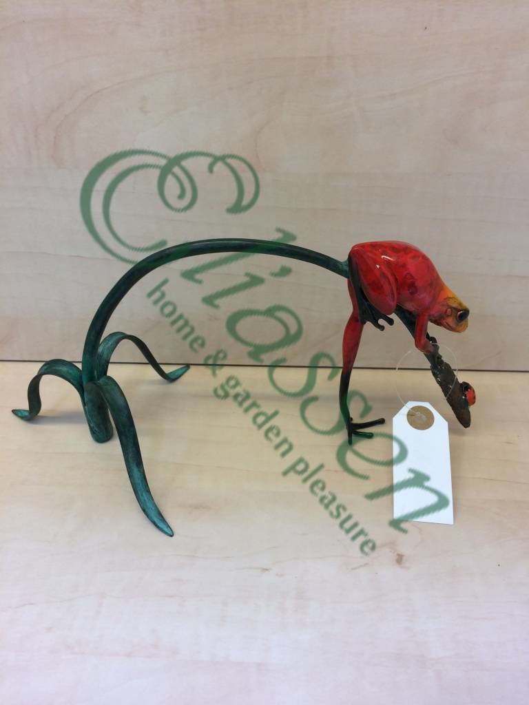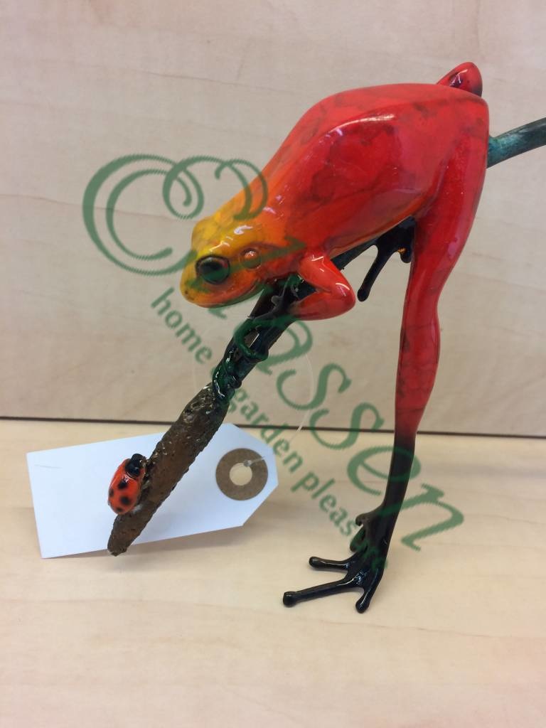 Mooi beeldje van een kikker, met gepolijste tenen, loerend op een lieveheersbeestje, is van hoogwaardig brons met een minimale kopergehalte van 75% waardoor een zeer lange levensduur gegarandeerd is.