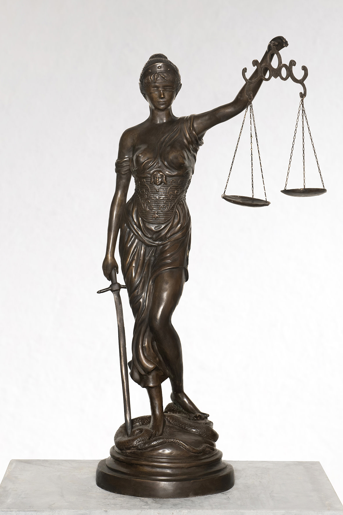 Dit bronzen tijdloze beeld van een grote vrouwe justitia heeft de maat ca. 52x16x120cm hoog en is op ambachtelijke wijze gemaakt met de zogenoemde verlorenwas methode.