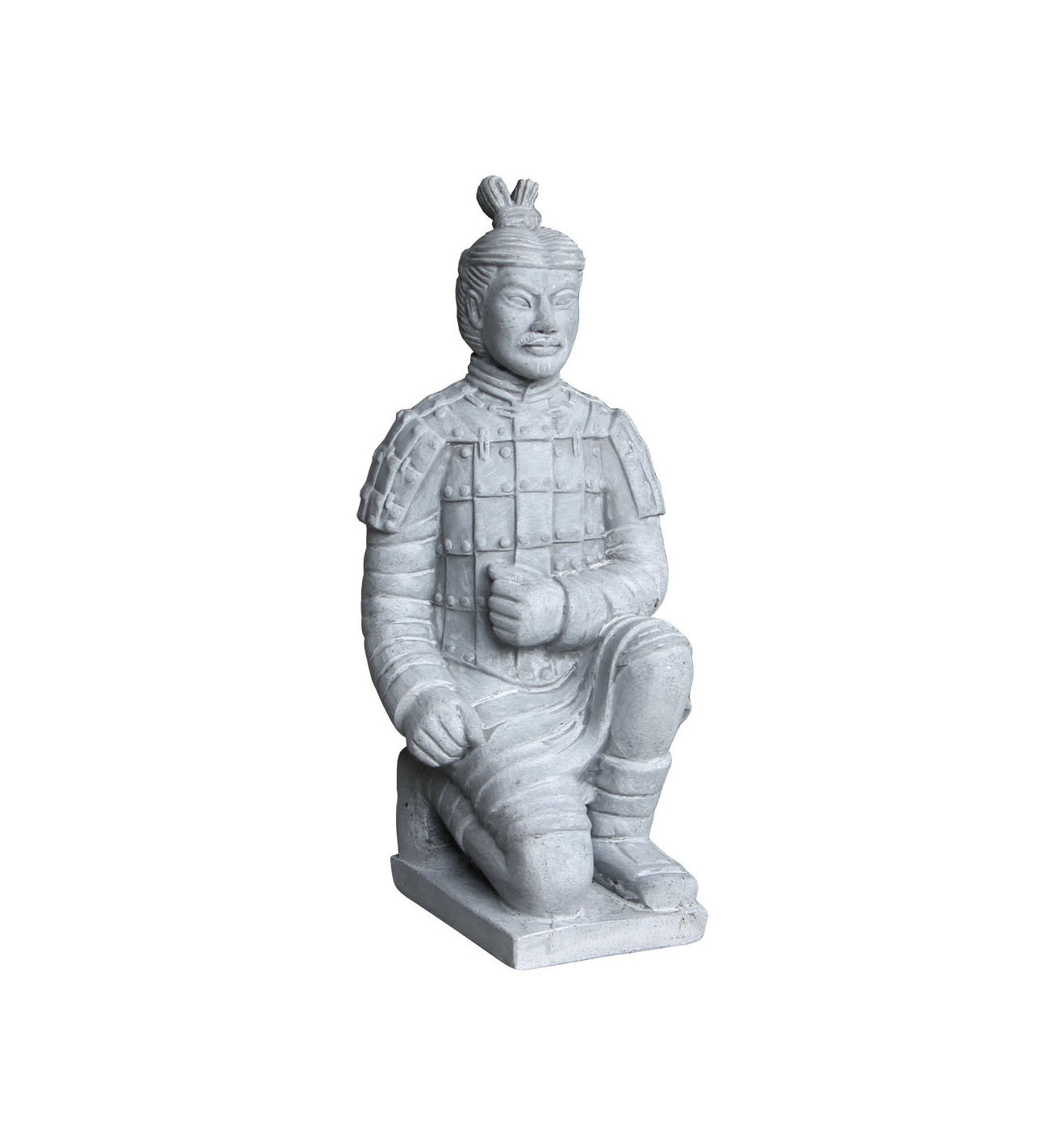 Deze stenen beeld van een geknielde chinese krijger is gemaakt van het ijzersterke grijze fiberstone, prachtig afgewerkt tot in de kleinste details, van super kwaliteit. Fiberstone is gemaakt van gemalen natuursteen, gemengd met polyester-epoxyhars, en versterkt met glasvezel matten.