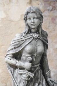 Mooi vormgegeven massief beeld van de beroemde Francaise Jeanne d’arc, compleet met wapenschild. Gemaakt van hoogwaardig gietsteen. Staat prachtig in elke tuin maar ook binnen. Dit beeld is 112 cm hoog en weegt 100 kg. Kan ook op sokkel geplaatst worden.