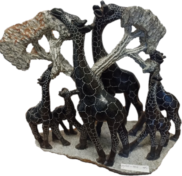 Dit model beeld met de beeltenis van een Afrikaanse Giraffen kudde onder bomen kan afwijken van de foto qua kleur en vorm, aangezien het handwerk is en tevens een natuur materiaal.