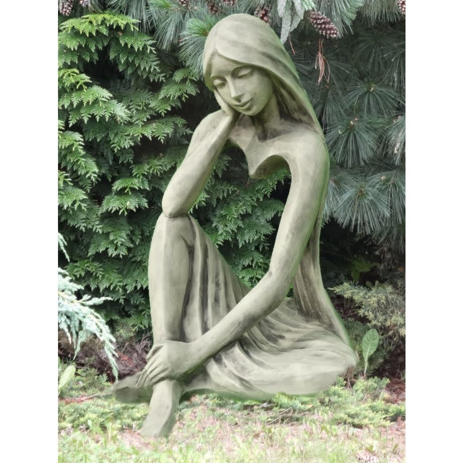 Een bijzonder mooi en modern beeld van een dame met lang haar , in een rustige zit houding. Gemaakt van het allerbeste gietsteen. Mooi gedetailleerd.