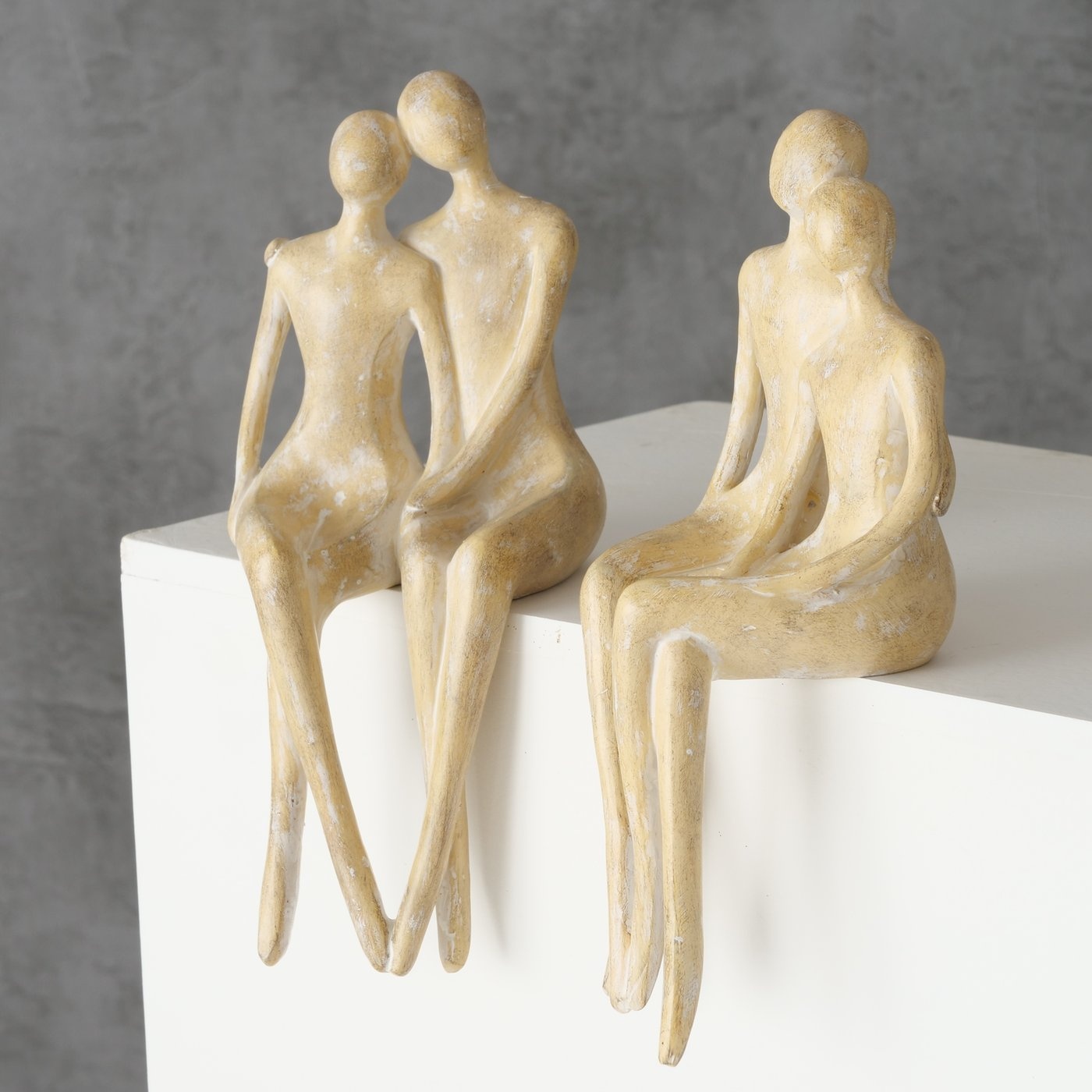 De benen hangen over de rand van een plank, kast, vensterbank enz. Gemaakt van polyresin; een mix van steenpoeder en polyesterhars.