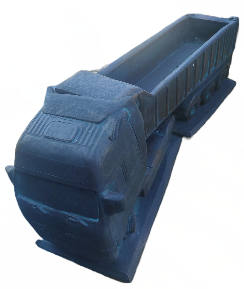 Deze stenen vrachtwagen is een mooi object in elke tuin.
