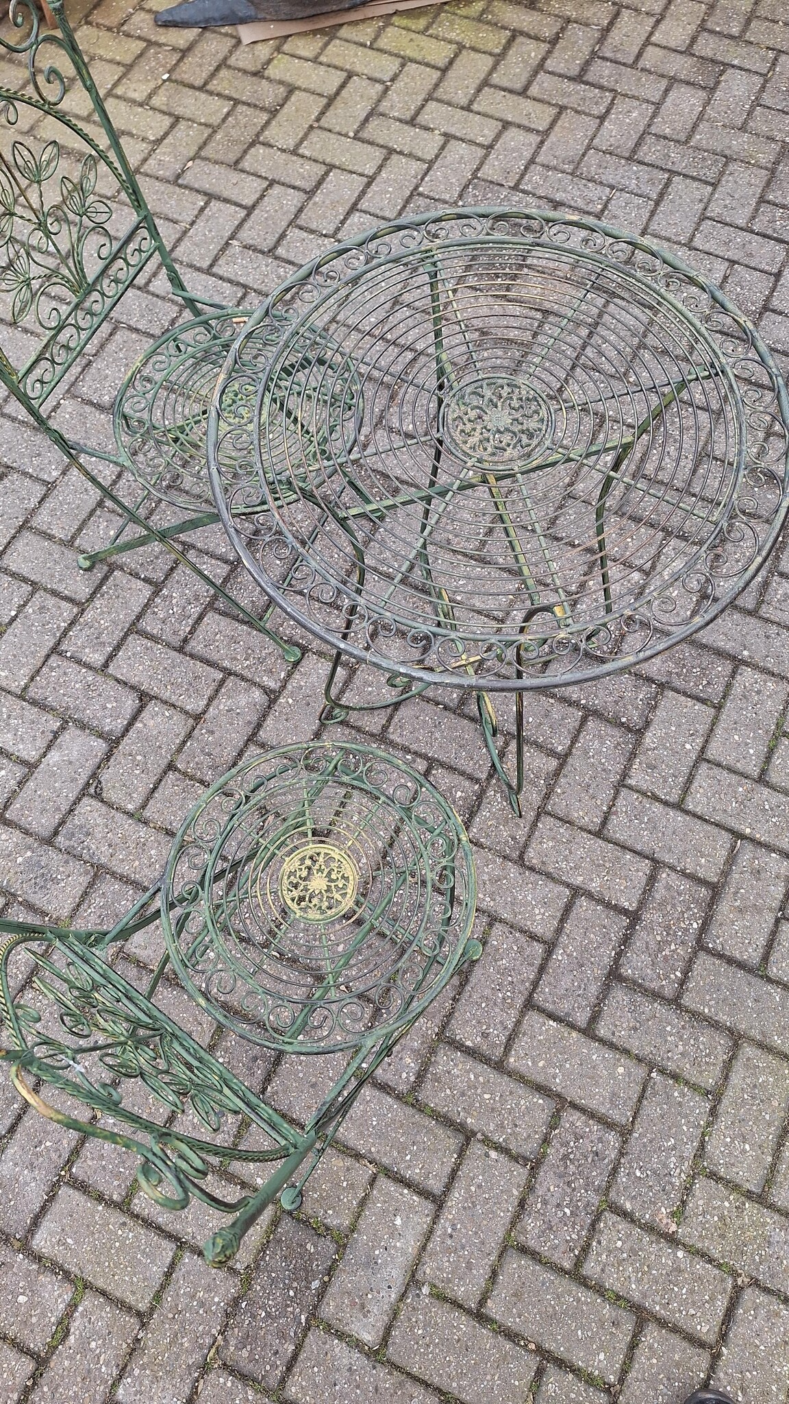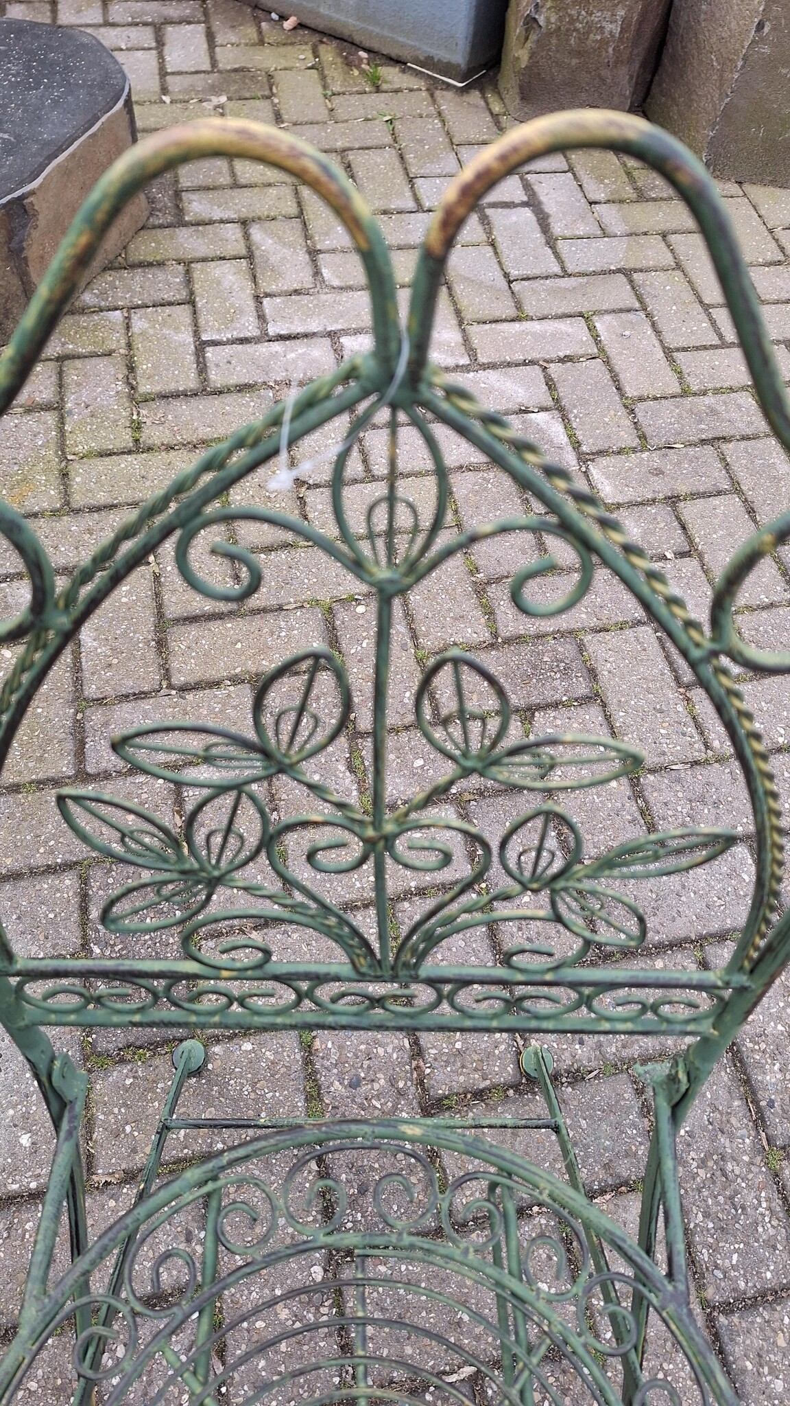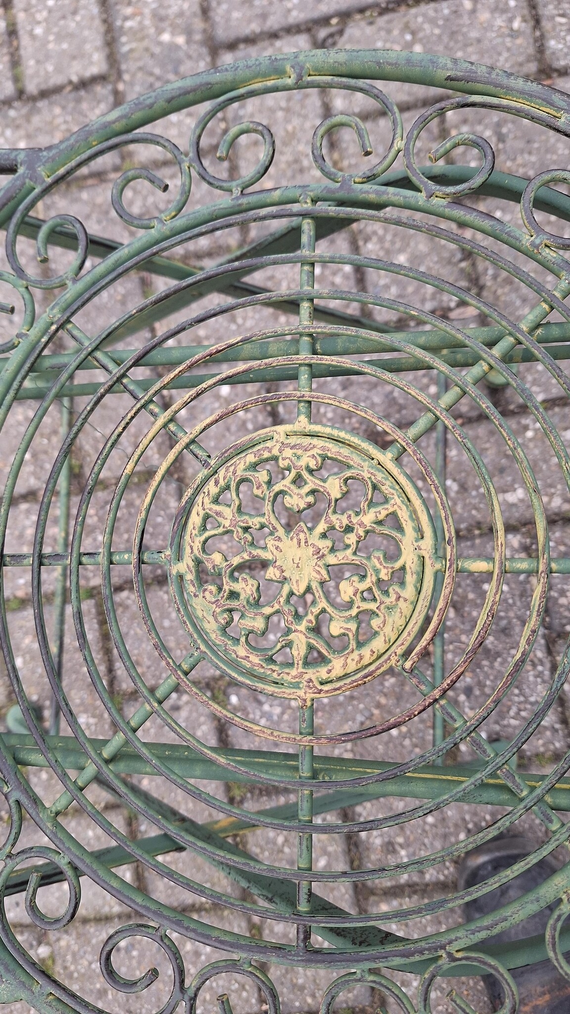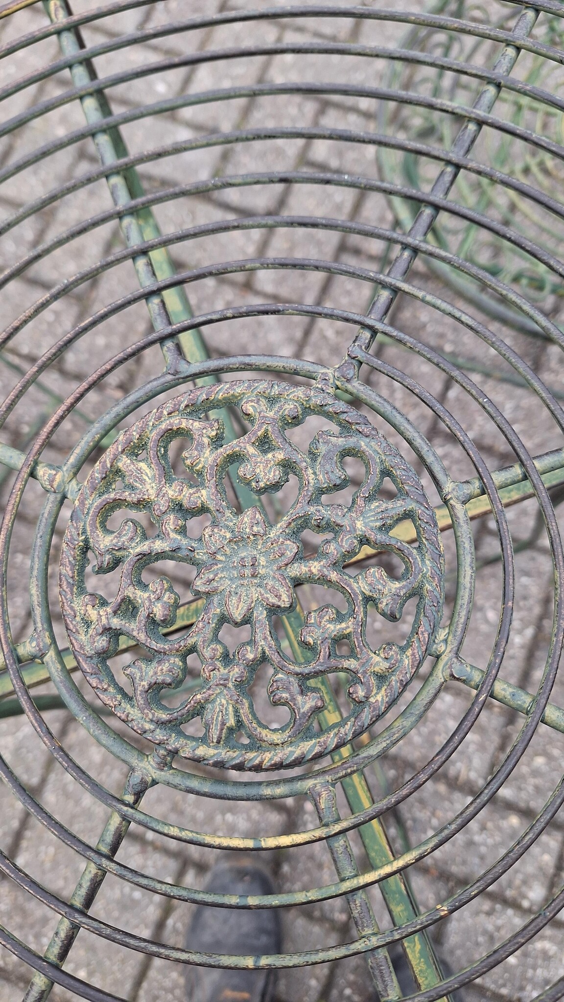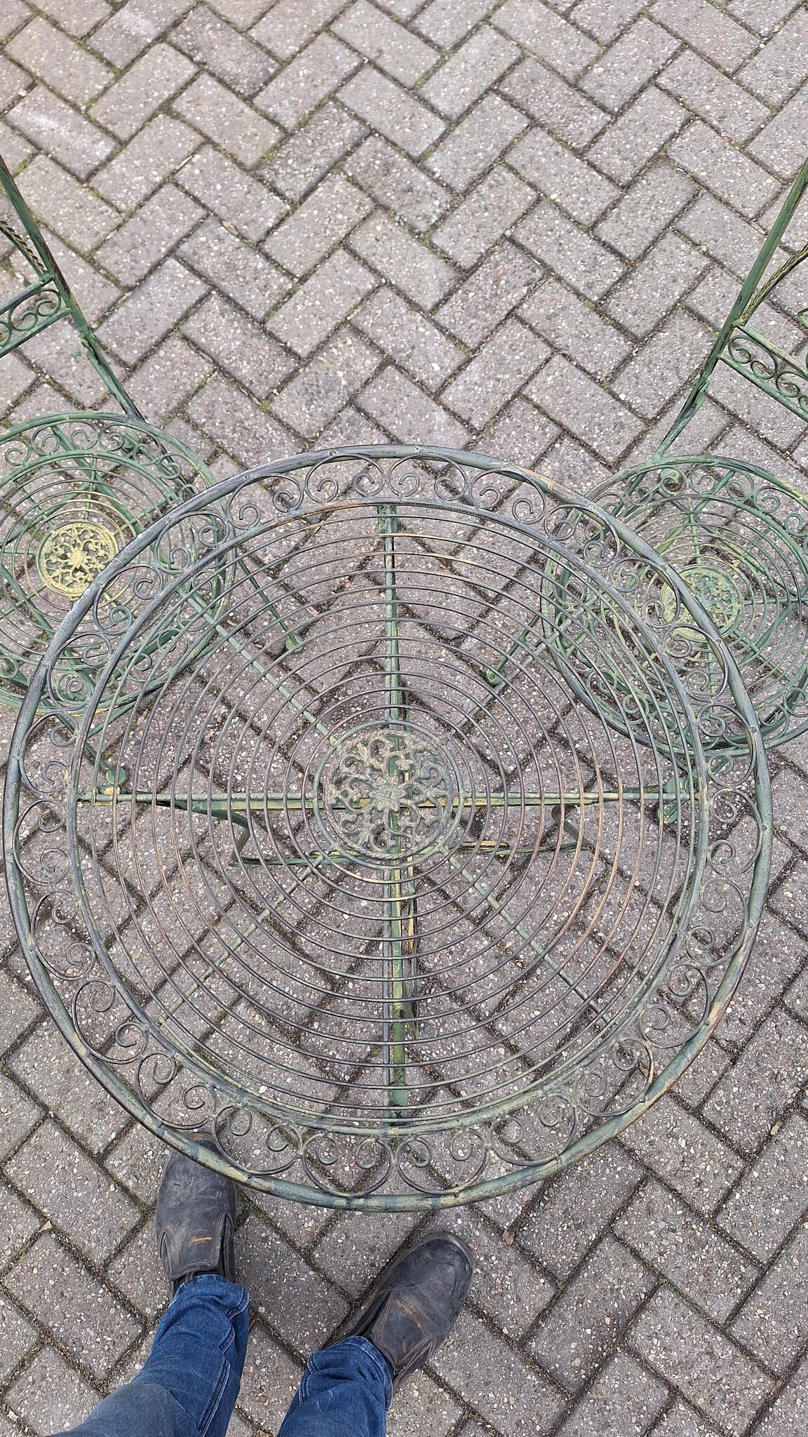 Een klassiek maar tijdloos model, deze romantisch gevormde ijzeren bistroset. Prachtig gemaakt van metaal. Geverfd in een mooie oude kleur groen, en daarna met andere kleur ingewassen, zodat er een mooie antieke look is ontstaan. Wat zult u in deze bank knusse uurtjes doormaken! Deze set is flink stevig en zwaar en zorgt voor jarenlang plezier.