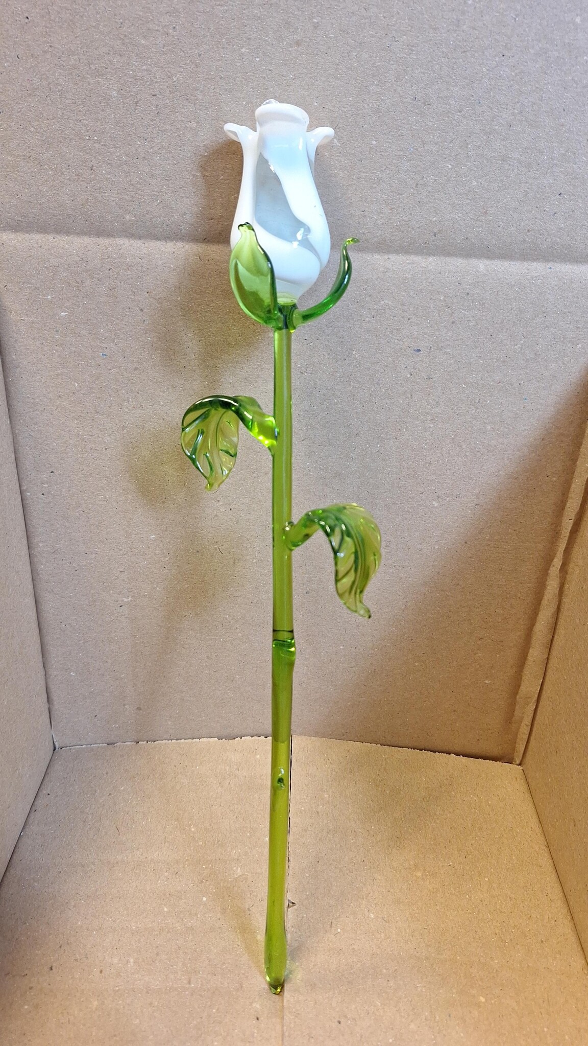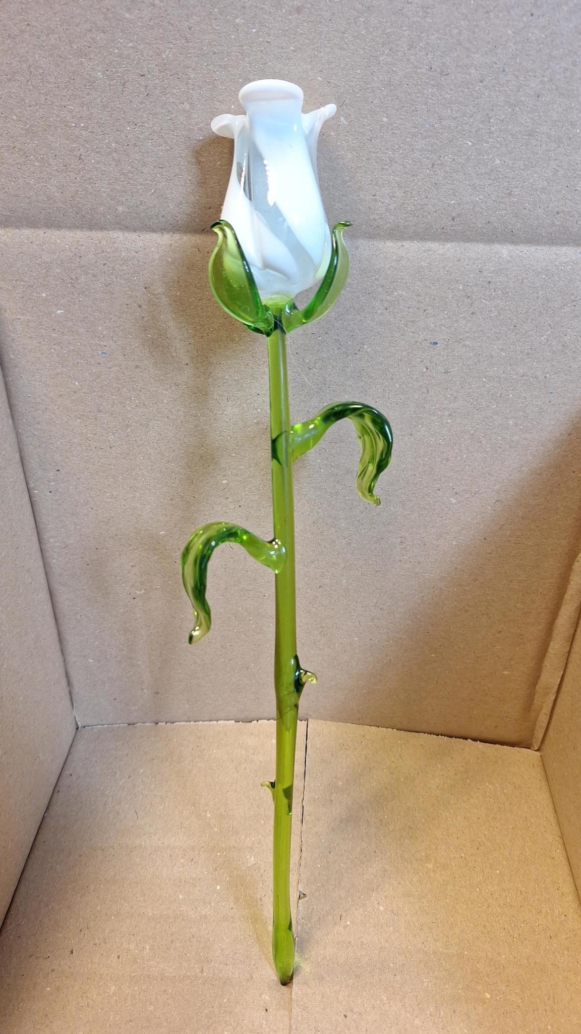 Bent u een liefhebber van glazen voorwerpen?, dan zult U deze witte roos ook wel mooi vinden.
