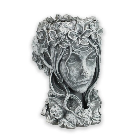 Een heel mooi vervaardigd hoofd van een bosvrouw. Mooi in detail gemaakt, kan tevens gebruikt worden als bloempot. Een echte eye-catcher voor binnen en buiten. Dit beeld past perfect binnenshuis als decoratiestuk voor , maar is ook fraai buiten op een sokkel.