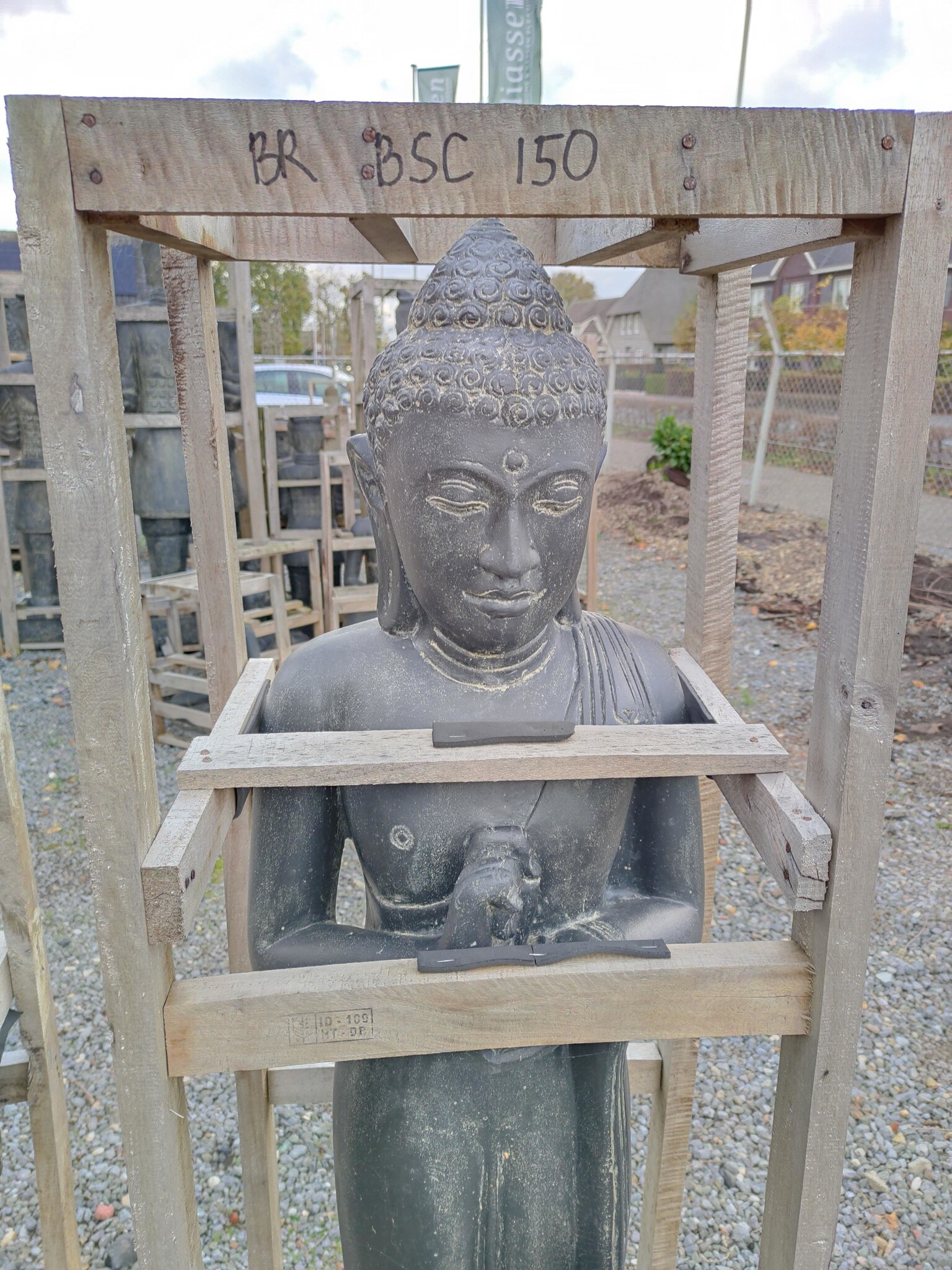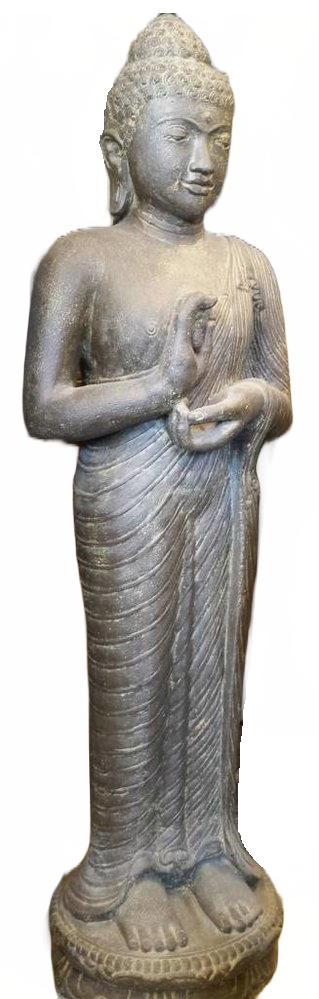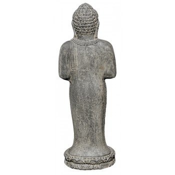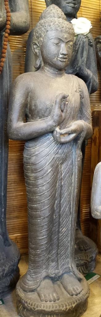 Beelden uit deze serie zijn allemaal gemaakt van hoogwaardig gietsteen met een zeer hoog cement gehalte, waardoor al deze beelden met gemak alle weersinvloeden kunnen weerstaan. De kleur is zwart/bruin en kan altijd wat afwijken van de foto omdat heel deze serie handgemaakt is. Dit beeld van een staande boeddha Chakra in java stijl heeft 2 maten: 150cm hoog en 120cm. Staande Boeddha met een Chakra Mudra. Chakra symboliseert het wiel van het leven, binnen dat hij het aansluiten van zijn wijsvinger en duim die wijsheid symboliseert. Een Mudra betekent dat de positie en de betekenis van de handen, …Kies hier bovenaan uw maat.Grote eigen voorraad