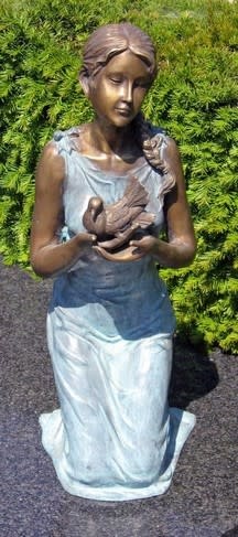 Dit bronzen klassieke beeld van een meisje met een duif op haar handen is op ambachtelijke wijze gemaakt met de zogenoemde verlorenwas methode.
