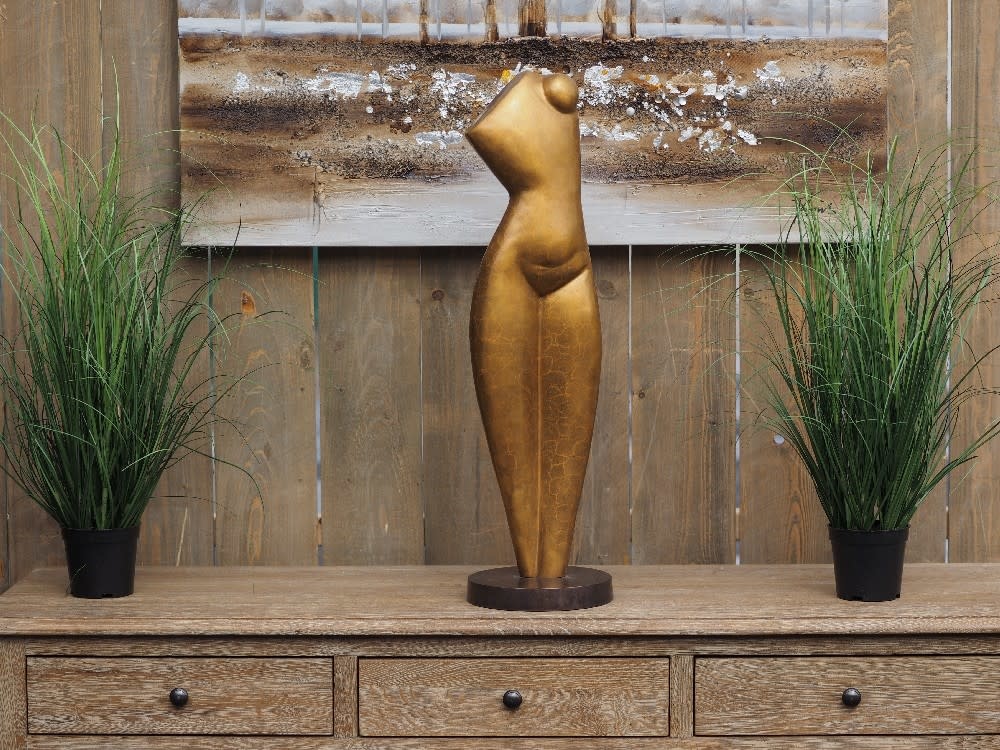 Modern beeld in goude kleuren van een buste van een vrouw. De afmetingen zijn 20x20x70cm en het is handgemaakt.