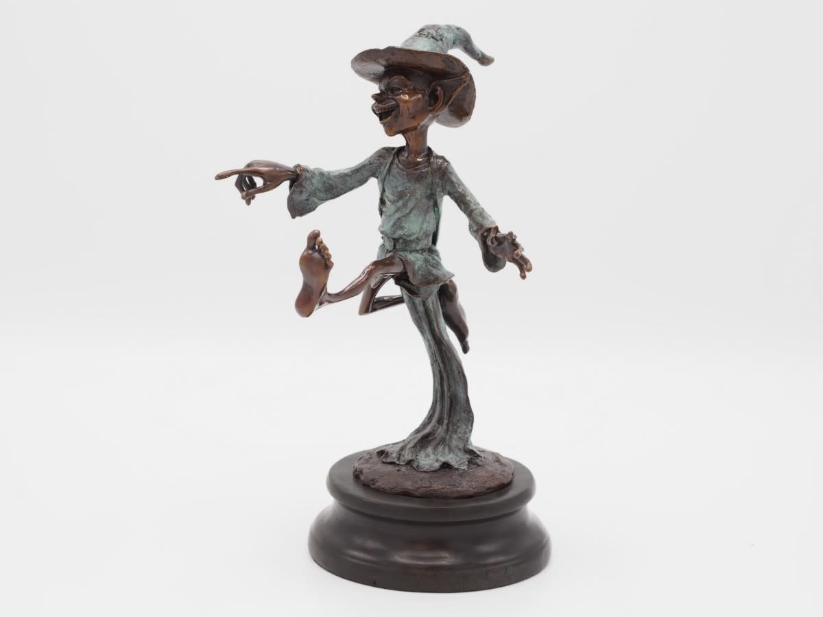 Dit bronzen tijdloze beeld van een pixie met een voet omhoog heeft de maat 15x12x27cm en is op ambachtelijke wijze gemaakt met de zogenoemde verlorenwas methode.