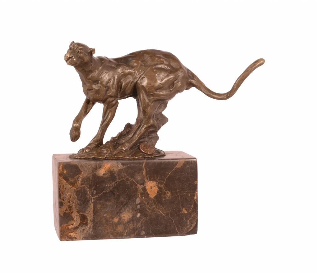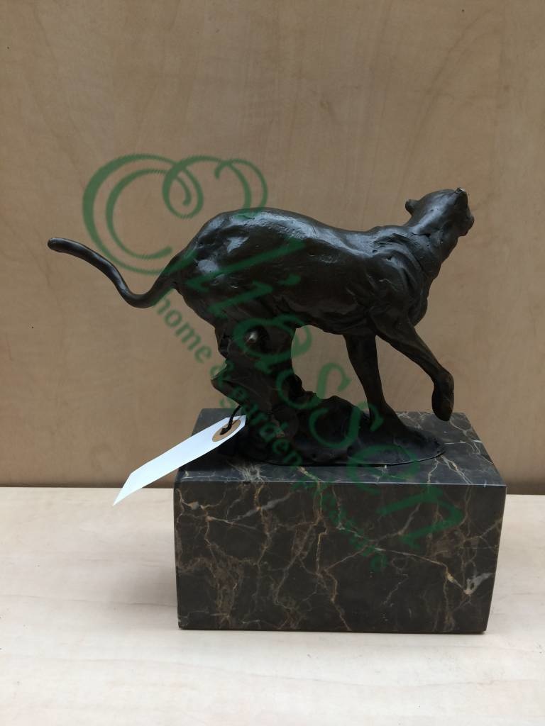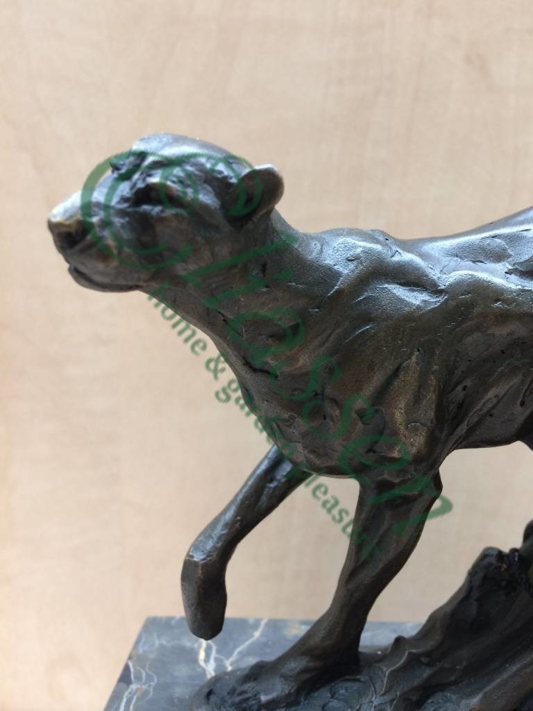 Mooi beeld van een poema, op marmeren voet, van 100% hoogwaardig brons met een minimale kopergehalte van 75% waardoor een zeer lange levensduur gegarandeerd is en geen lelijke vlekken ontstaan. Een prachtig en duurzaam decoratie object voor huis , bedrijf of tuin, maar ook voor een prachti geschenk. Zoekt een een bronzen beeld voor een jubilaris? Wij kunnen ook tekstplaatjes voor op de sokkel voor u verzorgen.