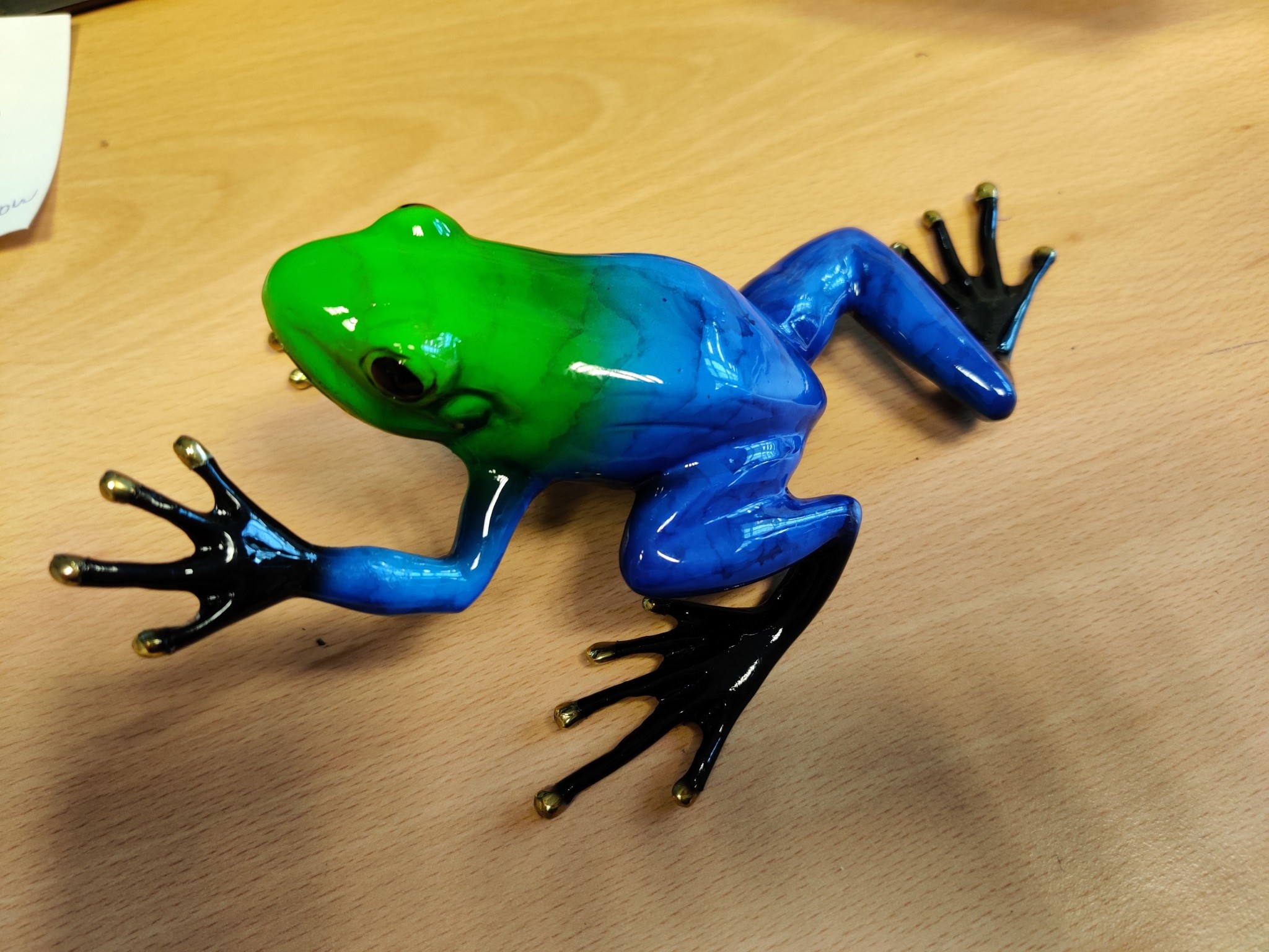 Mooi beeldje van een blauwe regenwoud kikker, met gepolijste tenen, is van hoogwaardig brons met een minimale kopergehalte van 75% waardoor een zeer lange levensduur gegarandeerd is.