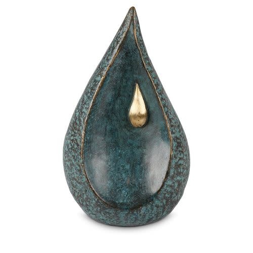 Een prachtig vormgegeven bronzen urn met een druppel en een as-reservoir waar een gedeelte van het crematie-as bewaard kan blijven. Zo bezit u een mooi gedenkornamentje.