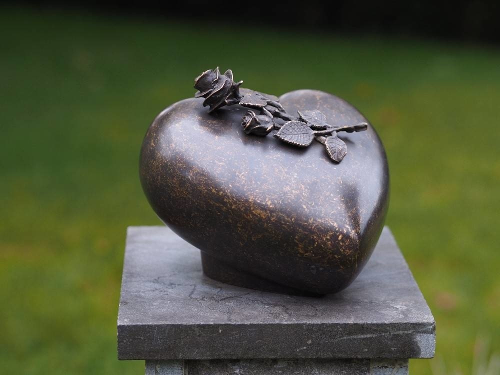 Een Urn, met roos, eventueel geschikt om as van een dierbare in te bewaren. Binnen of buiten, Voorzien van vulschroef aan de onderzijde. Helemaal gemaakt van brons. Het brons wat voor dit beeld gebruikt is, heeft een minimaal kopergehalte van 75%, hetgeen het voorkomen van oxidatie of andere vreemde plekken gewaarborgd wordt.