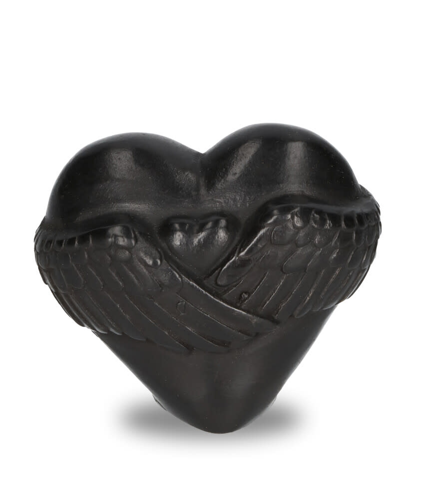 Een prachtig vormgegeven bronzen urn in de vorm van een hart met diverse decoraties met een as-reservoir waar een gedeelte van het crematie-as bewaard kan blijven. Zo bezit u een mooi gedenkornamentje.