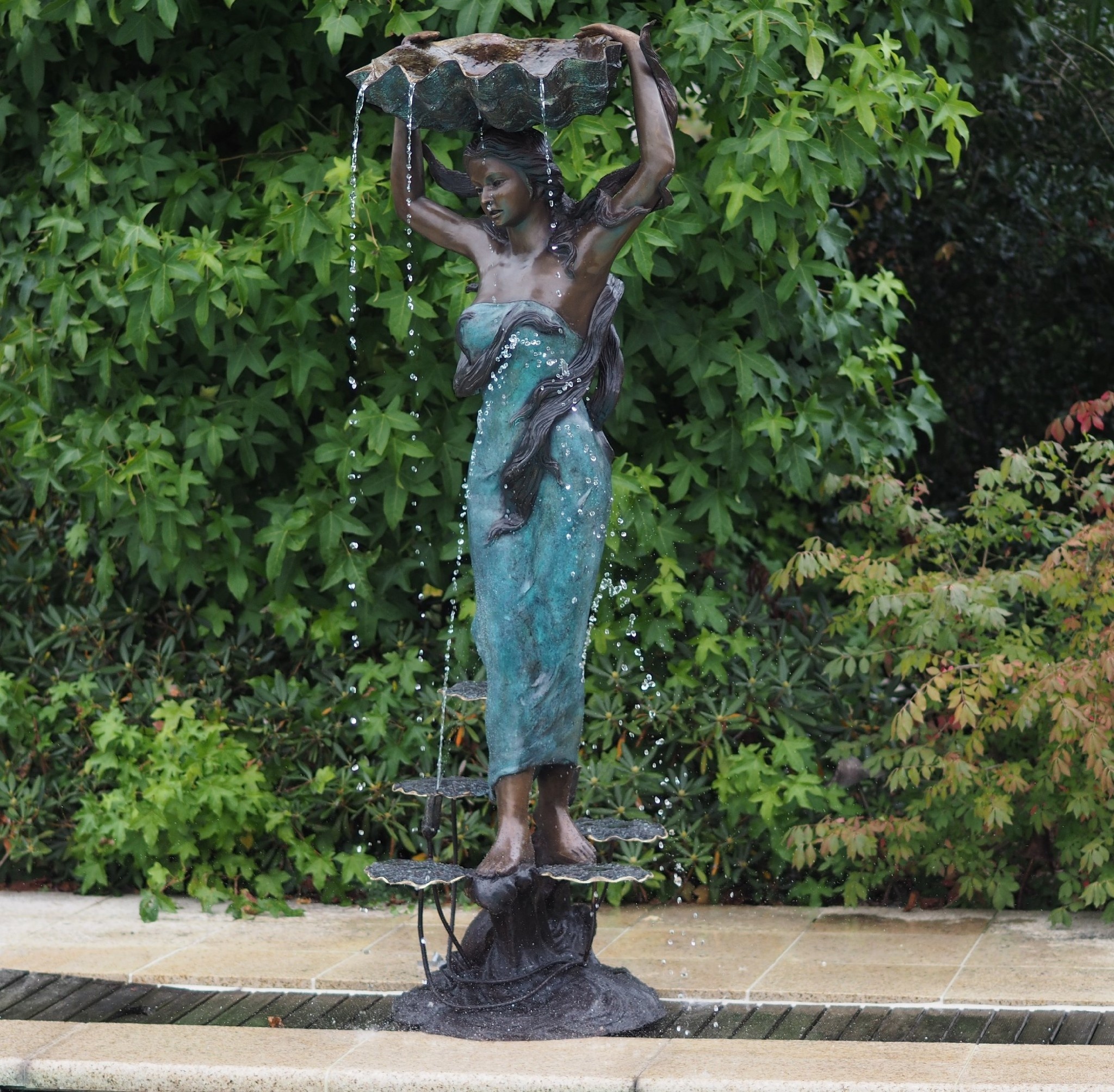 Mooi beeld van een vrouwenfontein van hoogwaardig brons met een minimale kopergehalte van 75% waardoor een zeer lange levensduur gegarandeerd is.