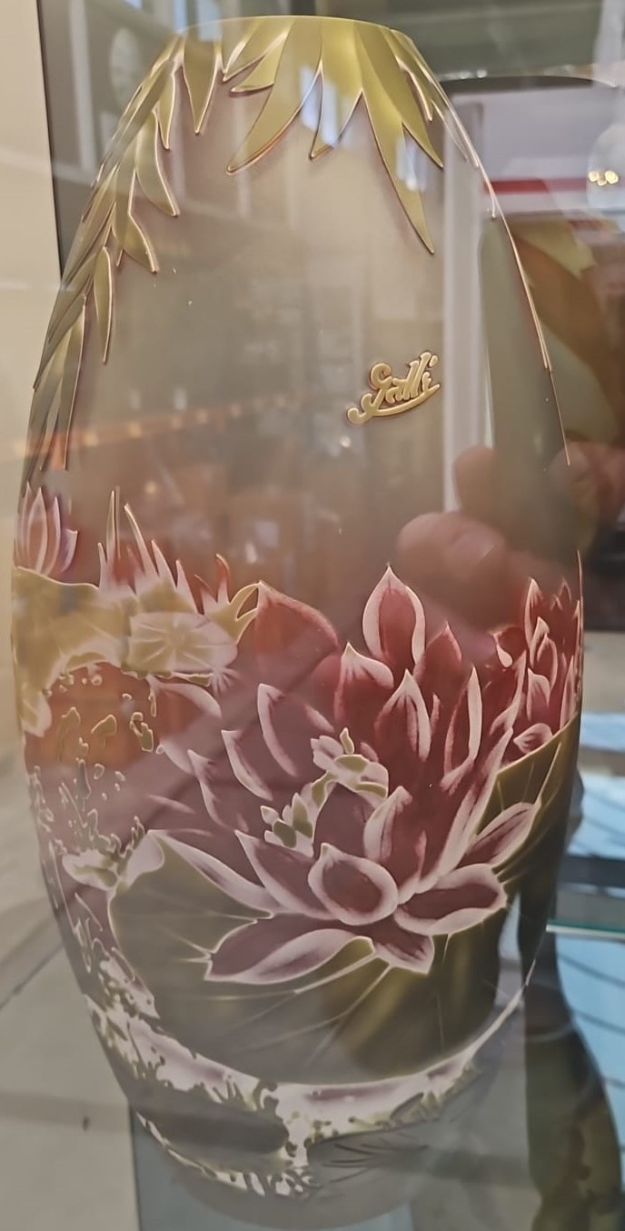 De glasvaas is handgemaakt volgens de authentieke cameo-kunstvorm afkomstig van de beroemde kunstenaar Emille Gallé. Er zijn verschillende lagen te zien op deze glasvaas. Hierdoor ontstaat er een bijzonder mooi en uniek effect.