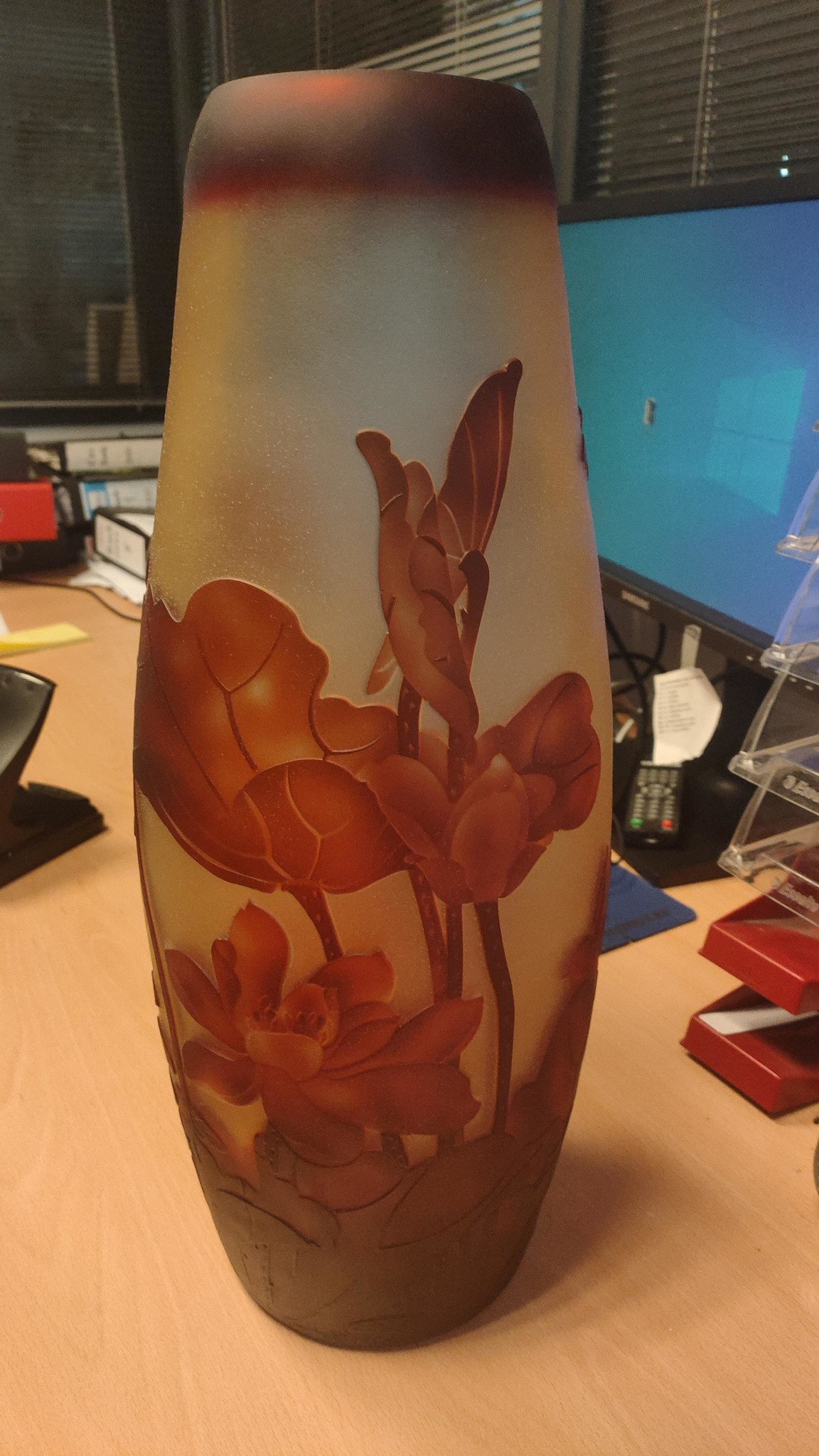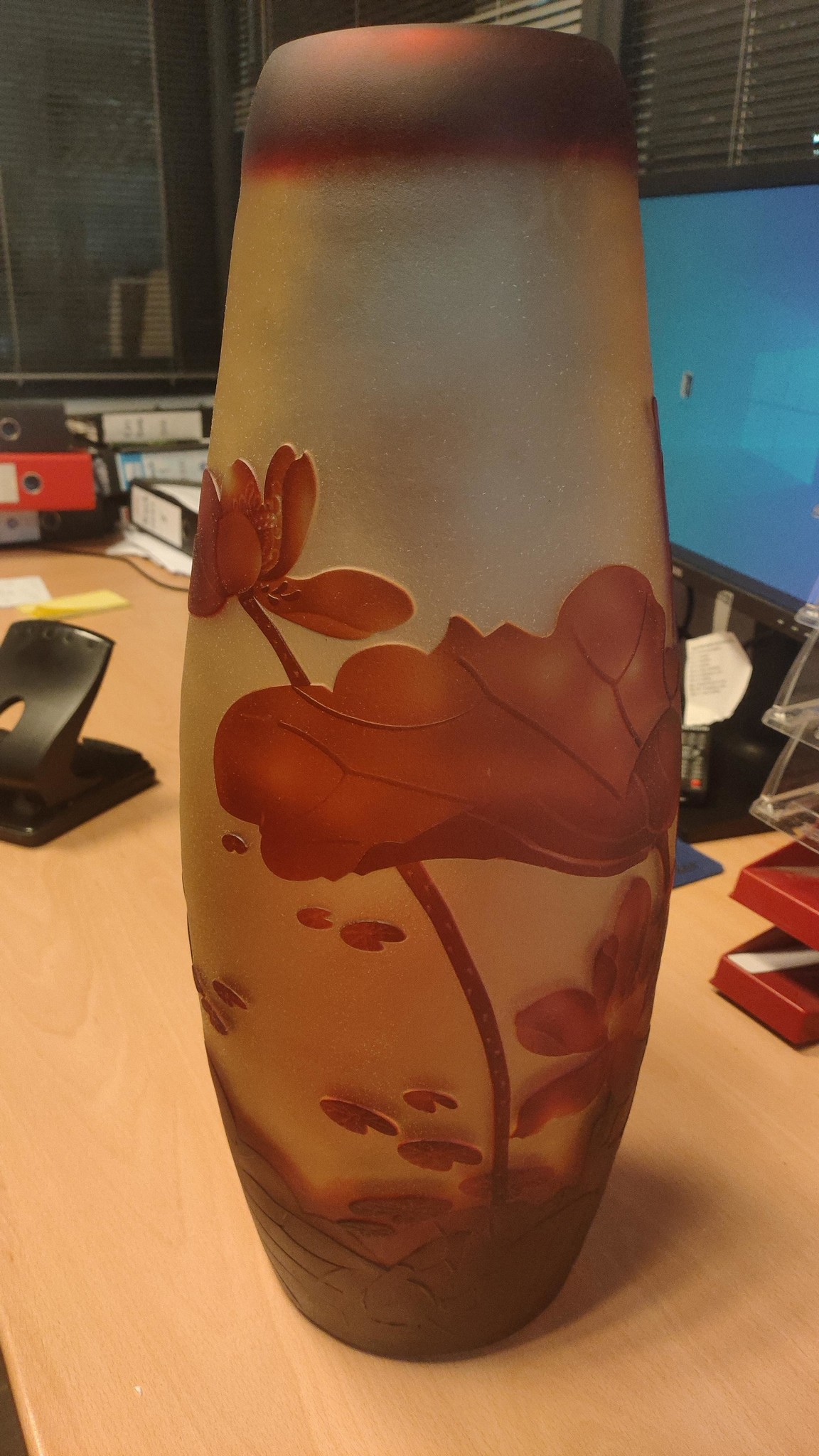 Mooie grote rood kleurige grote vaas met waterlelies van glas in een sierlijke vorm die gemaakt is volgens de oude Cameo techniek, naar voorbeeld van de wereldberoemde glaskunstenaar Émile Gallé.