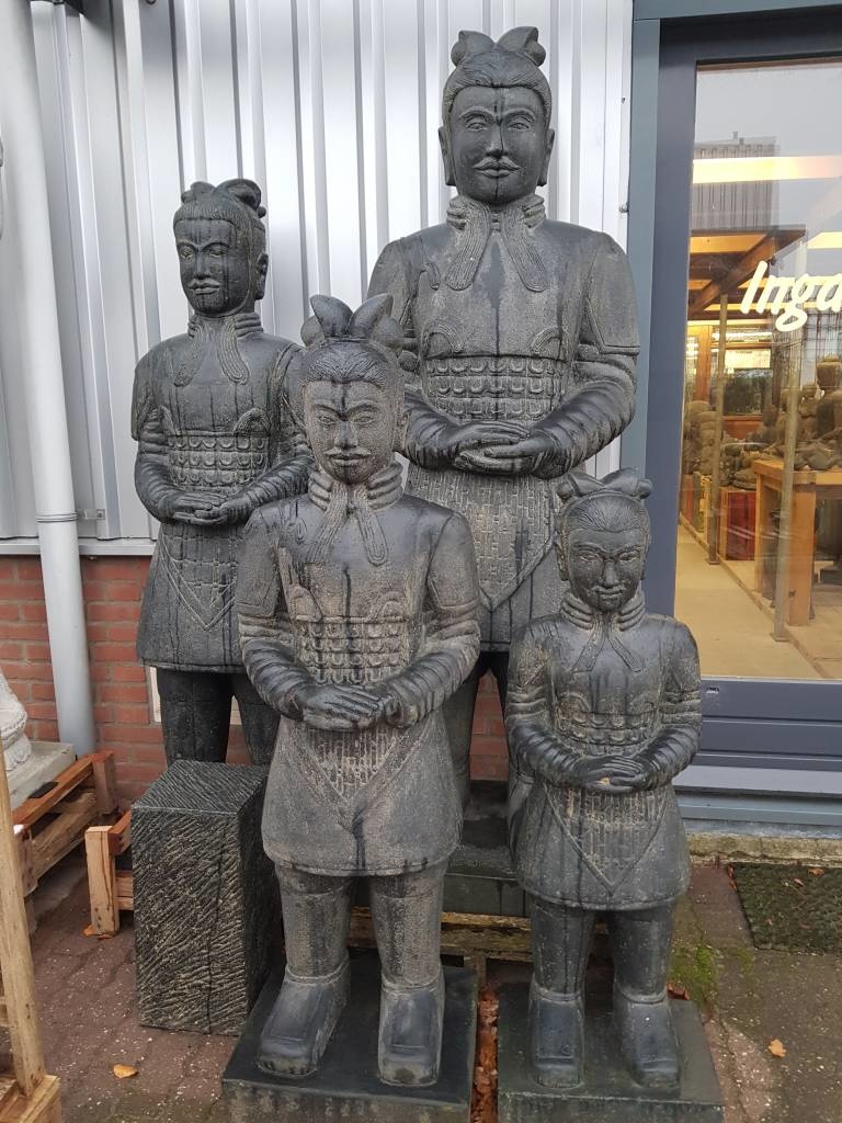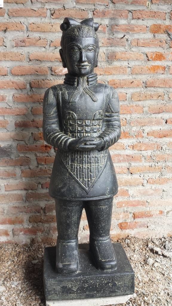 Chinese krijger van het bekende terracotta leger uit het Chinese Xián. Gemaakt van hoge kwaliteit gietsteen, in een donkerbruine kleur. Dit model is 120cm hoog en 40cm breed.