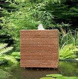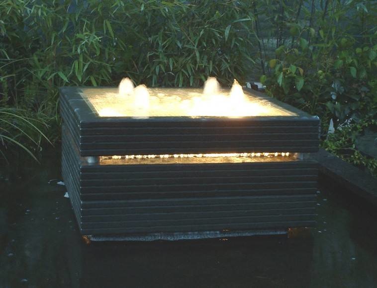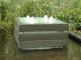 Het bovenste blok heeft een gewapende glasplaat waarover het water uitstroomt dmv 4 uitlopen. hetgeen een mooi effect geeft als er onderin het ornament een spot geplaatst wordt, het licht schijnt dat door de bovenzijde. ( te zien bij waterpartijenbenodigdheden).