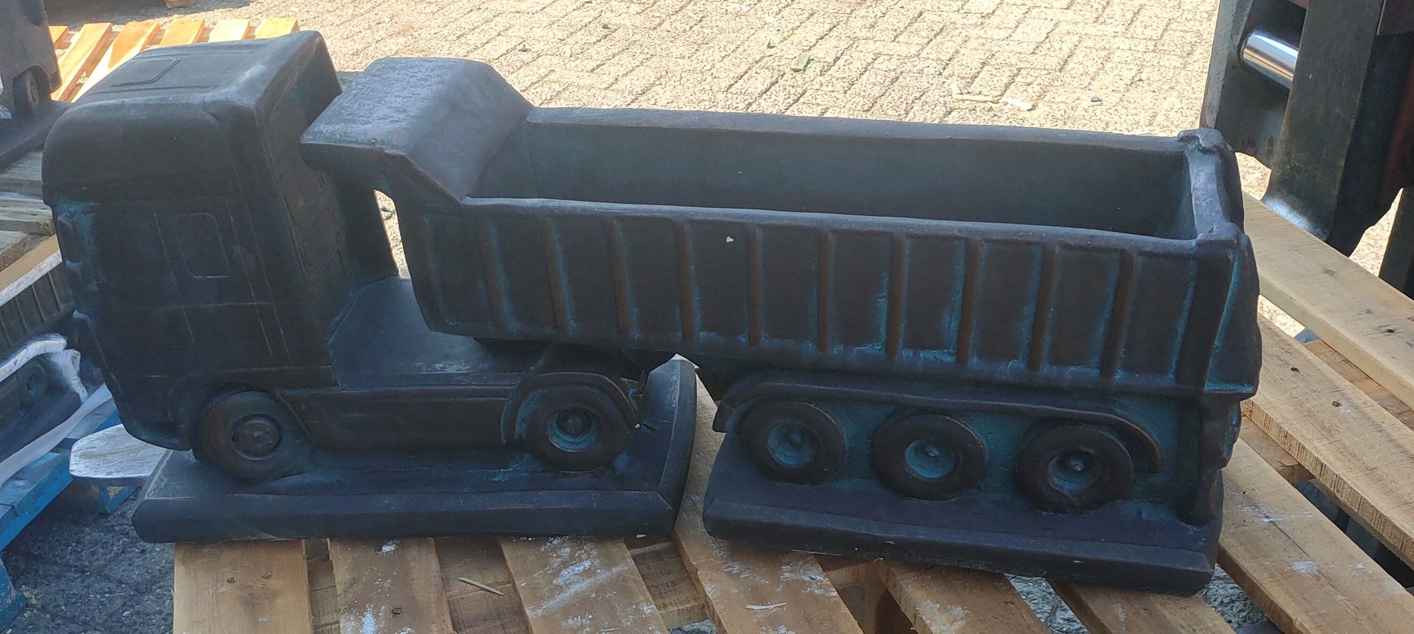 Deze stenen vrachtwagen is een mooi object in elke tuin.
