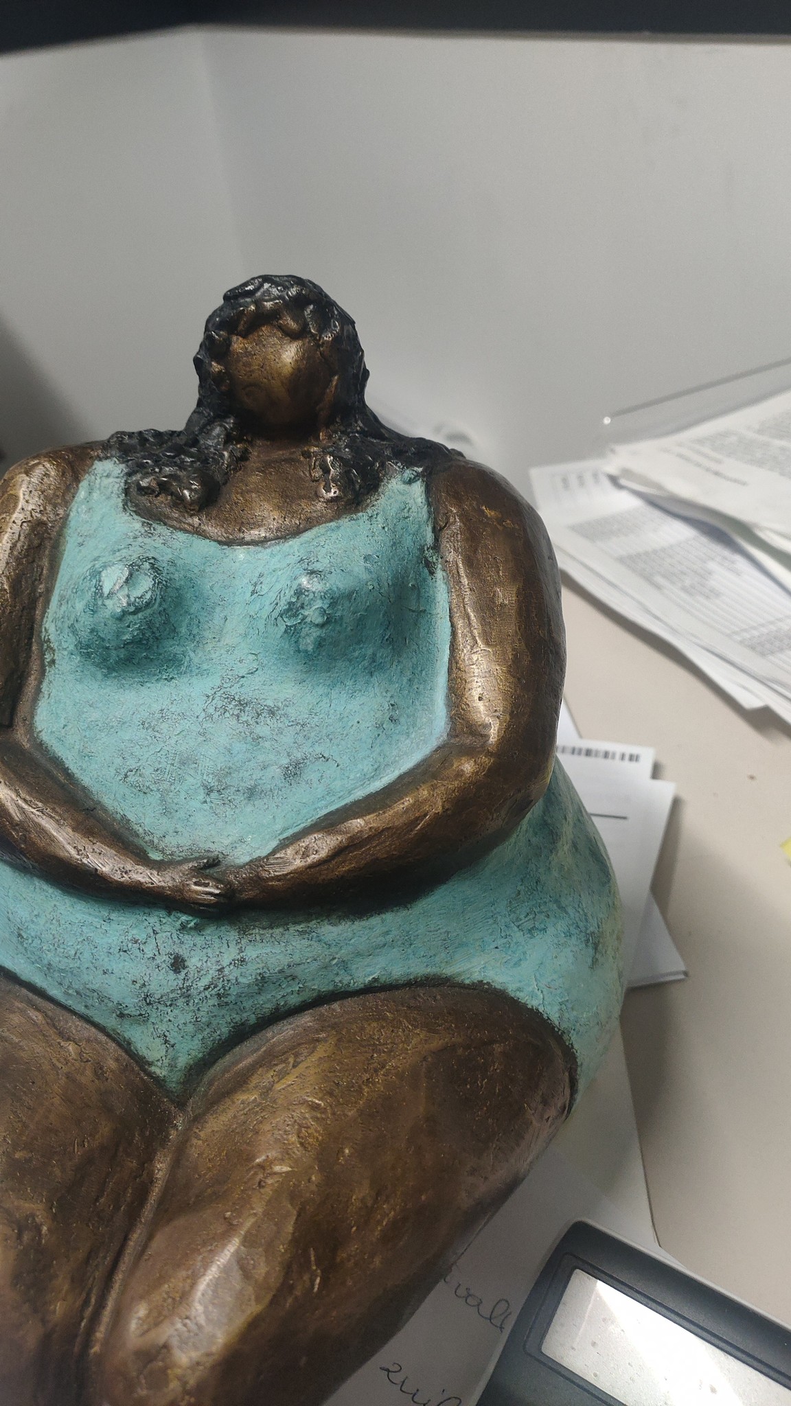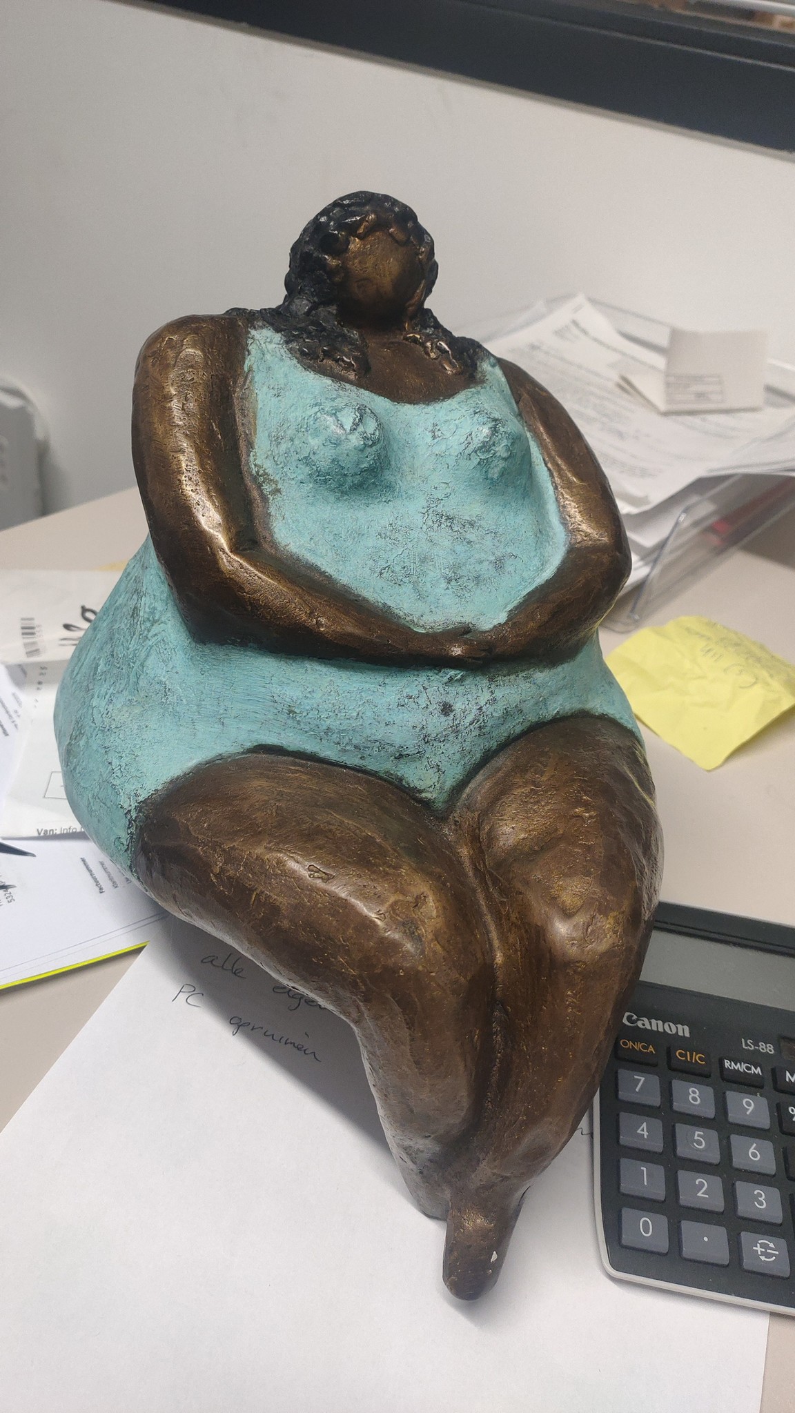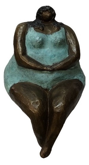 Mooi beeld van een stevige, zittende vrouw van hoogwaardig brons met een minimale kopergehalte van 75% waardoor een zeer lange levensduur gegarandeerd is.