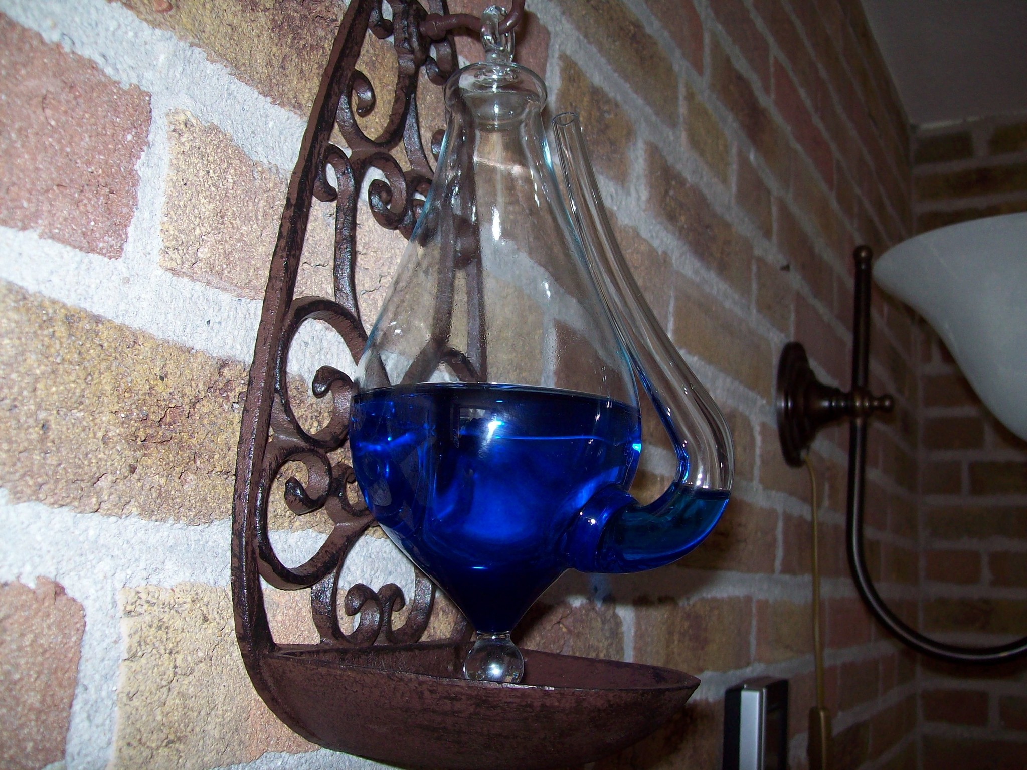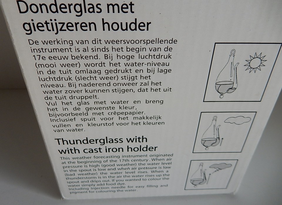 De werking van dit weers voorspellende donderglas of weerglas is al sinds het begin van de 17de eeuw bekend. Bij hoge luchtdruk (mooi weer) wordt het vloeistofniveau in de tuit van het donderglas omlaag gedrukt en bij lage luchtdruk (slecht weer) stijgt het niveau in de tuit van het donderglas. Bij naderend onweer zal de vloeistof zover kunnen stijgen, dat het uit de tuit van het donderglas druppelt. Vul het donderglas (slechts een derde) met of gekookt, of gedemineraliseerd water en breng het in kleur met bijgeleverde (blauwe) inktpoeder.