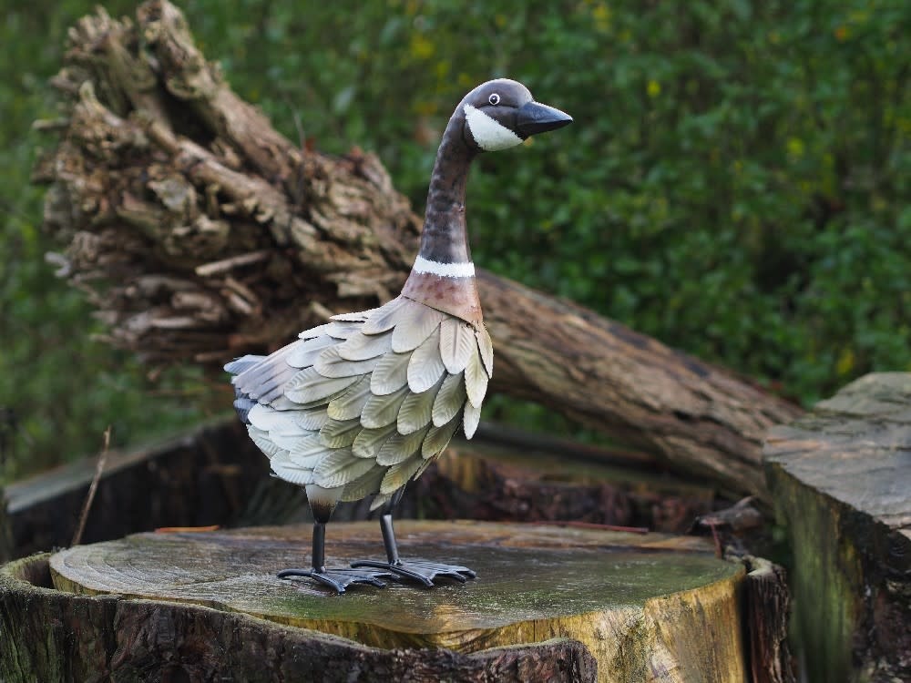 Schitterend afgewerkte metalen figuur van een grote staande eend. Een sierraad in huis of tuin en mooi om kado te doen. Helemaal met de hand gemaakt en geverfd.