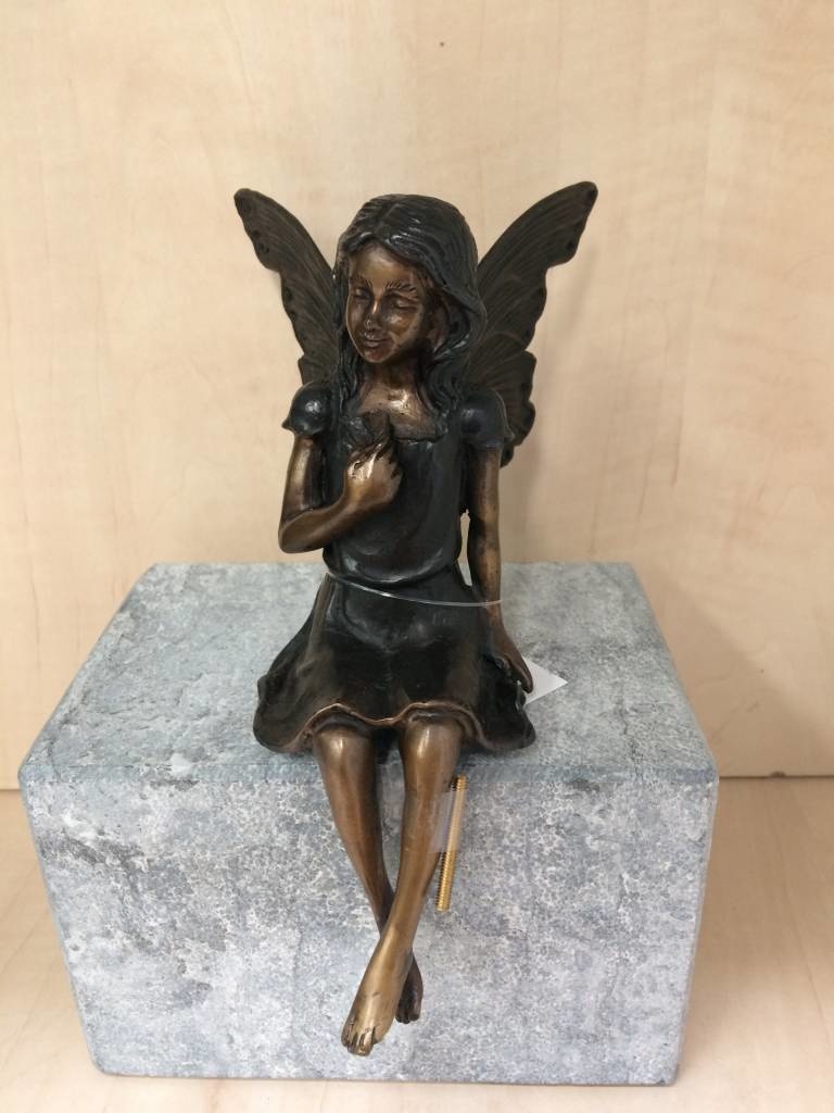 Mooi beeld van een elfje die met de benen over de rand zit, van hoogwaardig brons met een minimale kopergehalte van 75% waardoor een zeer lange levensduur gegarandeerd is.