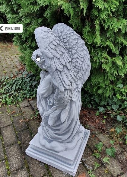 Prachtig groot vormgegeven beeld van een grijskleurige Engel op een knie, biddend, van hoogwaardige gietsteen, grijs ingewassen. De hoogte is 78cm en 68kg zwaar.