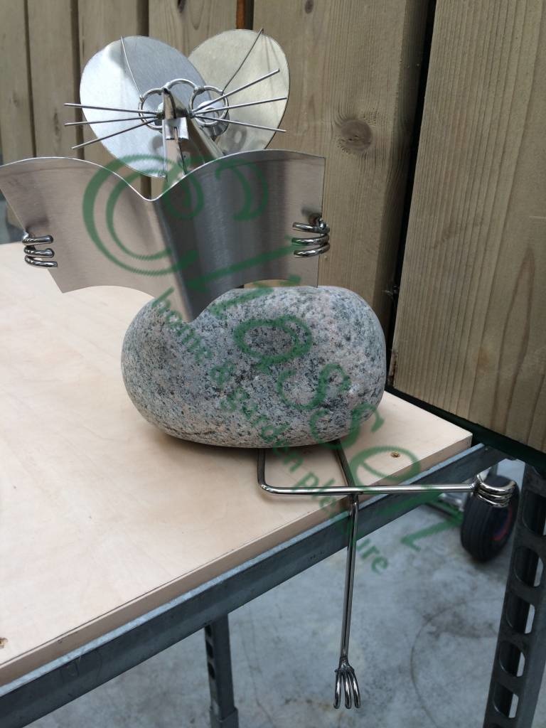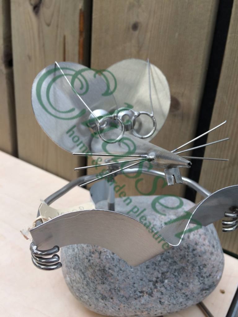 Leuk in de tuin maar ook binnenshuis, deze exclusieve figuur van een zittende muis met een natuurkei als lijf. Stevig staand, met een levenslange levensduur bij normale omstandigheden.Geheel is ambachtelijk gemaakt van rvs. Doordat het handwerk is zullen er altijd kleine verschillen in elk exemplaar kunnen bestaan met de foto, Ook de kei kan anders zijn qua kleur en vorm, hierop kan niet gereclameerd worden.