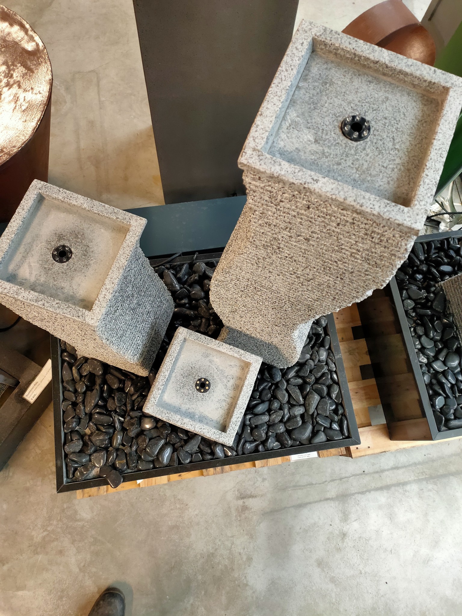 Een prachtig strakke moderne fontein voor in uw tuin of op het terras, in eigen beheer ontwikkeld en nergens anders te koop. De waterbak is gemaakt van effen pikzwart gepolijst graniet, de waterzuilen zijn van grijs gepolijst graniet die deels ingezaagd zijn, voor een zeer mooie schittering op het reliëf, zeker in het donker wanneer er een spot op gericht wordt.