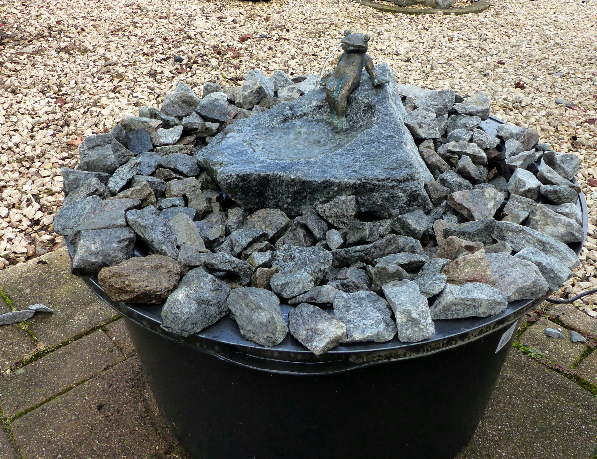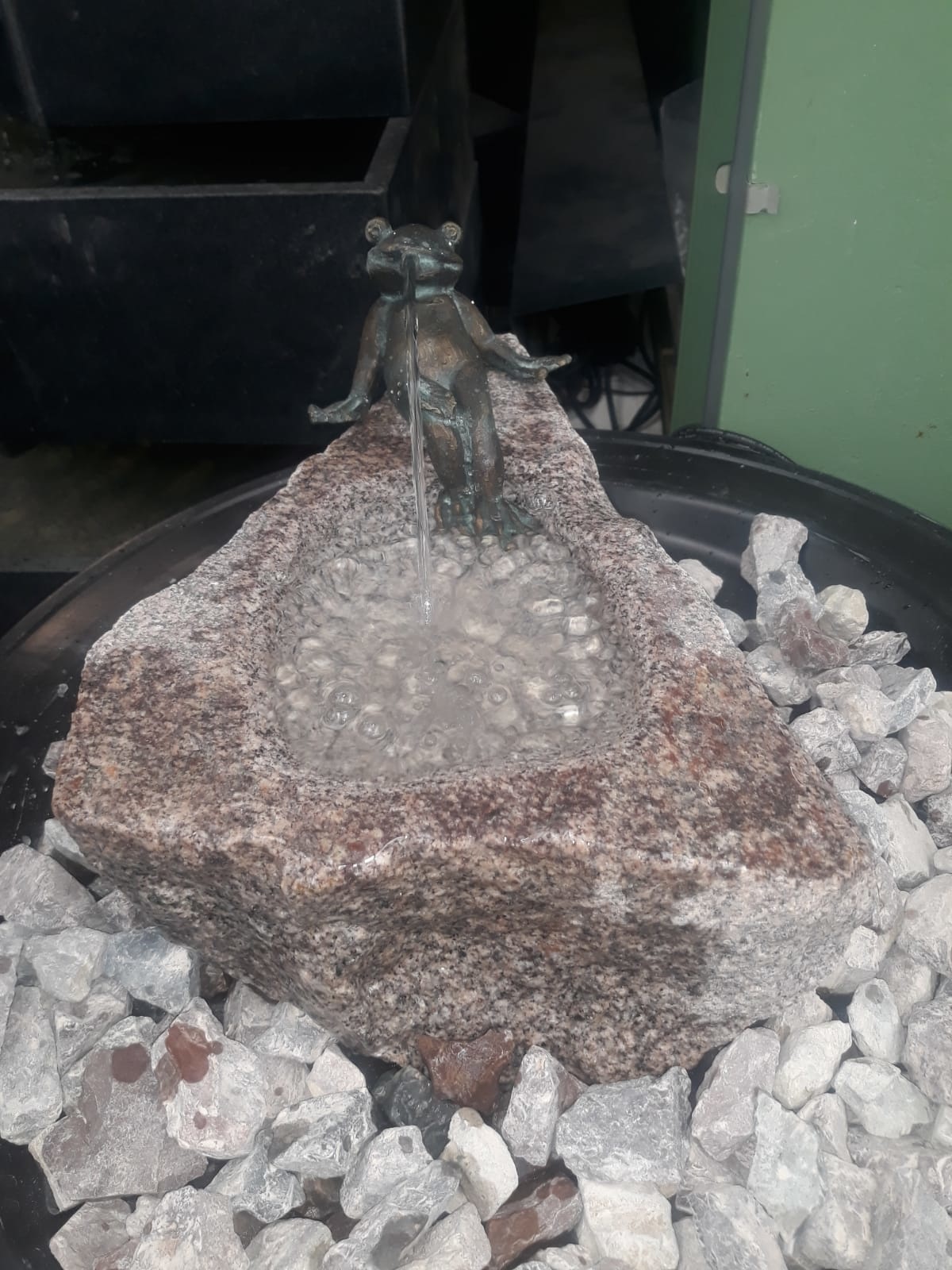 Complete fonteinset, om jarenlang van dit waterspel te genieten in uw tuin. Steen is van graniet, met op de steen een lui zittende kikker van echt brons. Vogels zullen van dit waterobject in de tuin ook zeker genieten.