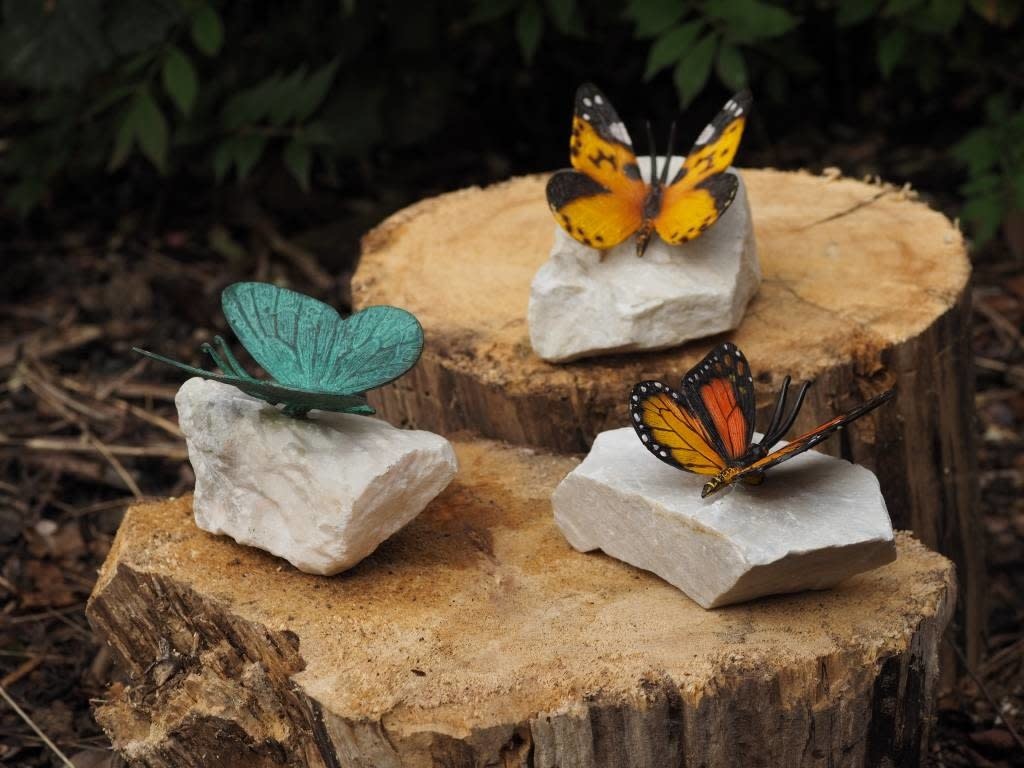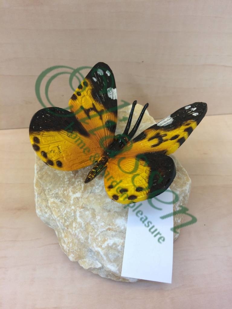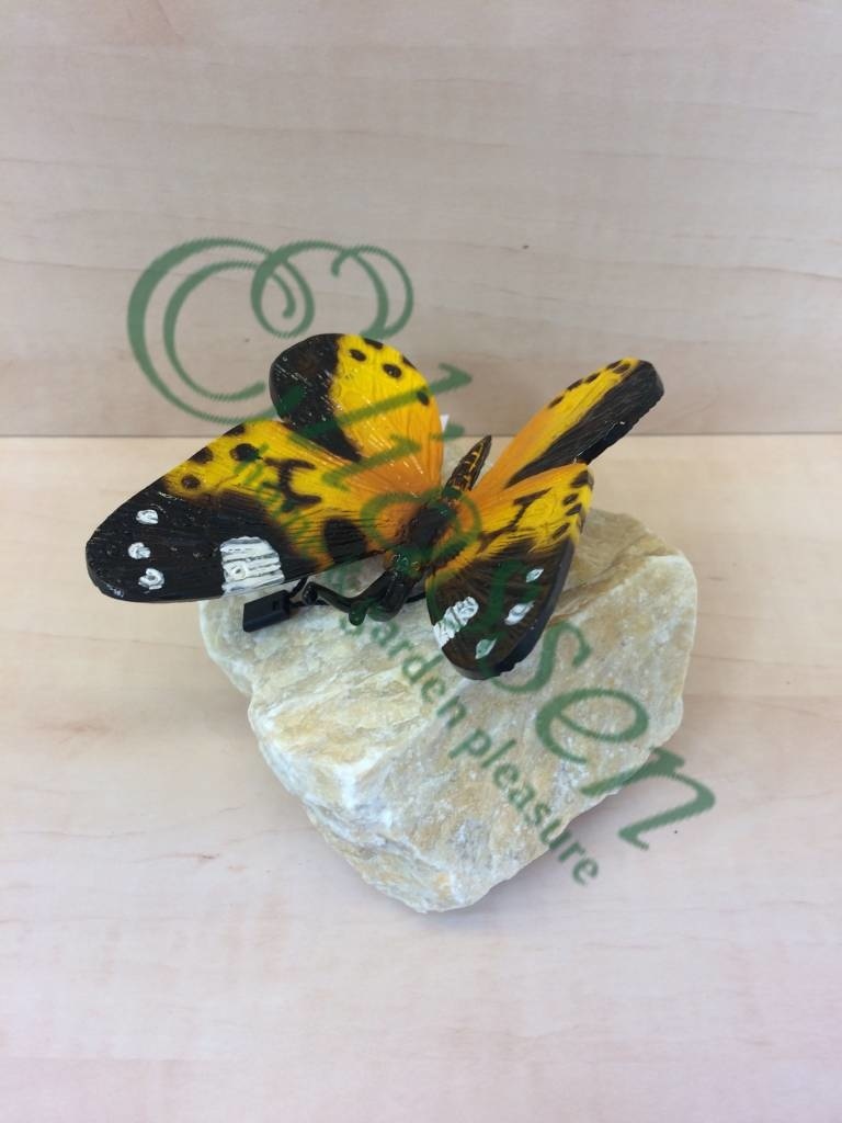 Mooie vlinder van brons op een steen, minimale kopergehalte van 75% waardoor een zeer lange levensduur gegarandeerd is.