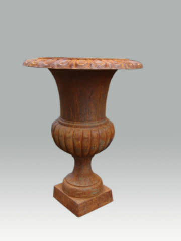 Dit gietijzeren tuinpot is onbehandeld, en is dus roestig. Gietijzer is een ijzersoort met een hoog koolstof gehalte. Gietijzer is uitstekend gietbaar en is onverwoestbaar. Een nadelige eigenschap van gietijzer is dat het kan breken, nooit dus een vaas van gietijzer laten vallen.