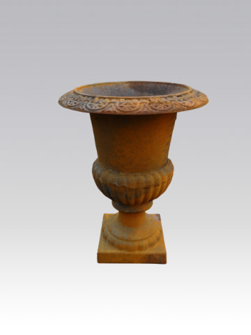 Dit gietijzeren tuinpot is onbehandeld, en is dus roestig. Gietijzer is een ijzersoort met een hoog koolstof gehalte. Gietijzer is uitstekend gietbaar en is onverwoestbaar. Een nadelige eigenschap van gietijzer is dat het kan breken, nooit dus een vaas van gietijzer laten vallen.