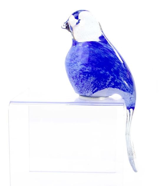 Glas vogel op tuinsteker hangende staart blauw 90cm.